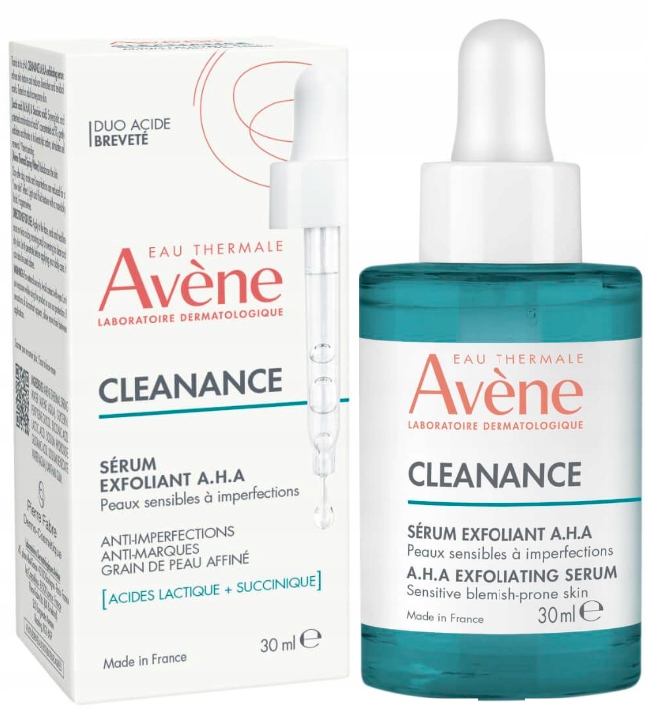 Avène Cleanance A.H.A serum złuszczające zostało stworzone z myślą o cerze skłonnej do trądziku, zmagającej się regularnie z niedoskonałościami oraz wrażliwej. Sekretem jego skuteczności jest połączenie 10 wyselekcjonowanych komponentów i aż 99% składników pochodzenia naturalnego, w tym opatentowane kwasy AHA. Obecność kwasu mlekowego i bursztynowego niweluje zmiany trądzikowe, zapobiega ich ponownemu powstawaniu oraz zwęża pory.