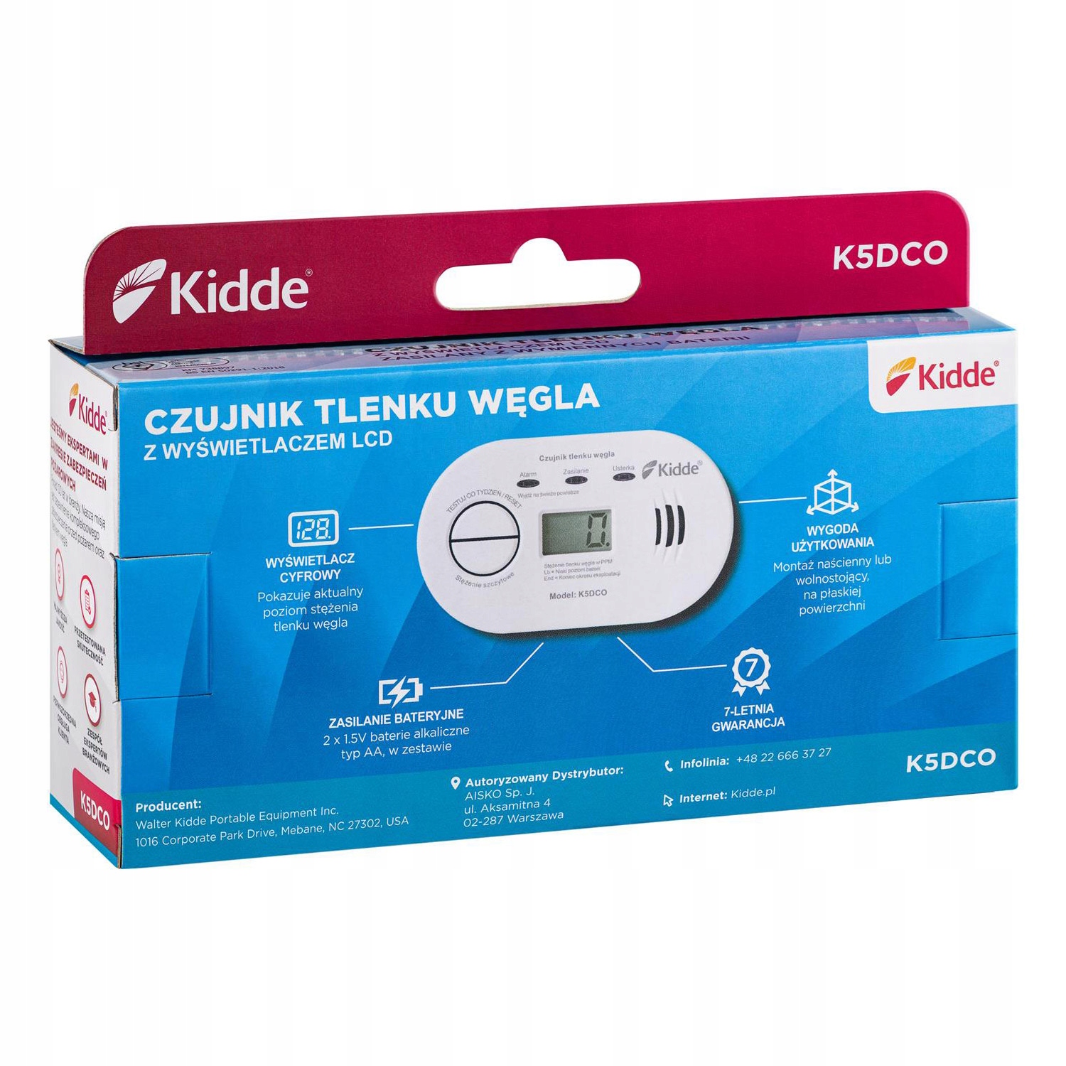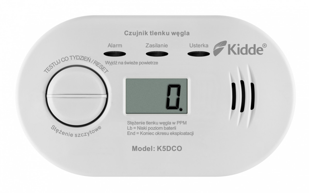Czujnik tlenku węgla z wyświetlaczem K5DCO wyposażony w sensor elektrochemiczny Kidde, gwarantujący 10-letni okres pracy. Zasilanie bateryjne umożliwia zamontowanie detektora w optymalnym miejscu w pomieszczeniu oraz zapewnia ochronę także w przypadku zaniku napięcia zasilania w sieci.