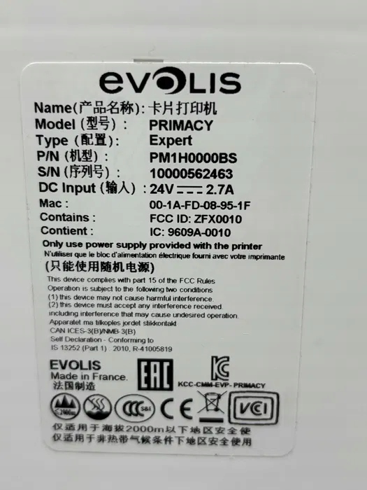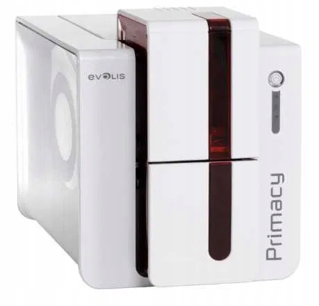 Evolis Primacy to obecnie najbardziej popularna drukarka marki Evolis do zadruku średnich ilości kart plastikowych. Urządzenie, w zależności od wybranej konfiguracji, posiada możliwość jednostronnego lub dwustronnego zadruku kart w rozdzielczości 300 dpi. W tym też celu wykorzystuje taśmy barwiące – czarną lub kolorową. Obsługuje standardowe karty plastikowe o wymiarach 85,6x54 mm oraz grubości w przedziale 0,25-1,25 mm. Standardowo wyposażona jest w interfejs USB oraz Ethernet. Evolis Primacy posiada także możliwość wyboru dodatkowych koderów: paska magnetycznego, kart zbliżeniowych (MIFARE, Unique) i chipowych oraz moduł lamintora. W zestawie znajduje się kabel zasilający.