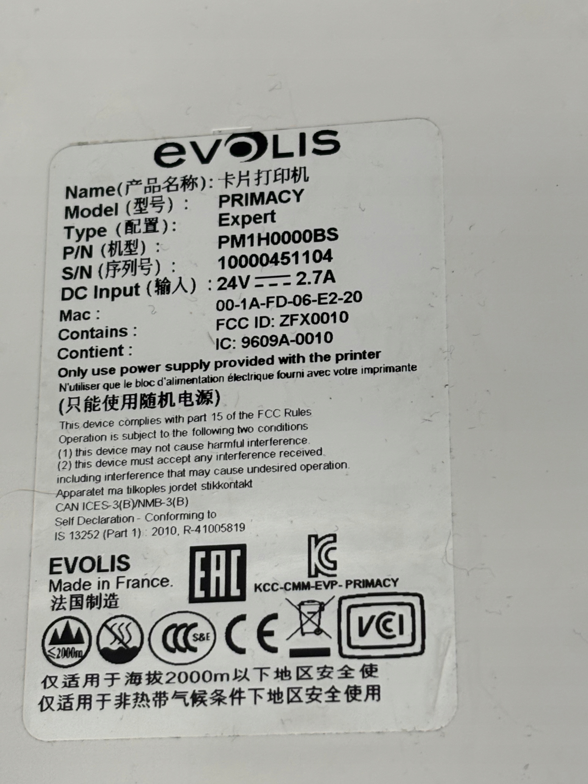 Evolis Primacy to obecnie najbardziej popularna drukarka marki Evolis do zadruku średnich ilości kart plastikowych. Urządzenie, w zależności od wybranej konfiguracji, posiada możliwość jednostronnego lub dwustronnego zadruku kart w rozdzielczości 300 dpi. W tym też celu wykorzystuje taśmy barwiące – czarną lub kolorową. Obsługuje standardowe karty plastikowe o wymiarach 85,6x54 mm oraz grubości w przedziale 0,25-1,25 mm. Standardowo wyposażona jest w interfejs USB oraz Ethernet. Evolis Primacy posiada także możliwość wyboru dodatkowych koderów: paska magnetycznego, kart zbliżeniowych (MIFARE, Unique) i chipowych oraz moduł lamintora. W zestawie znajduje się kabel zasilający.