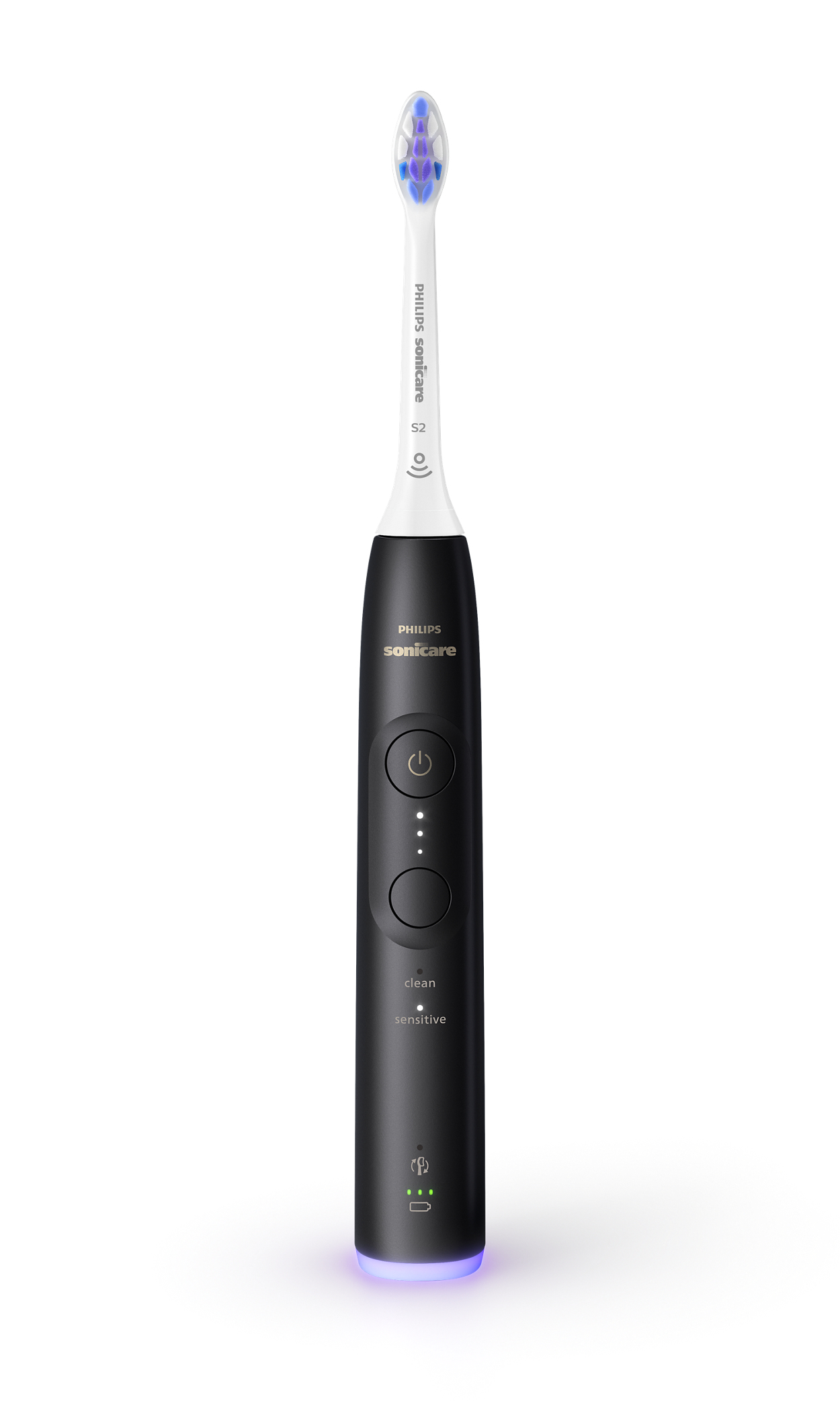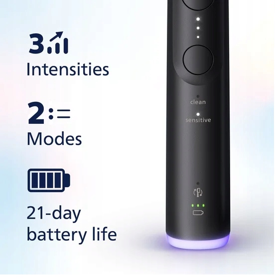Szczoteczka do zębów usuwa do 10 razy więcej płytki nazębnej niż szczoteczka manualna, co zapewnia lepsze usuwanie płytki nazębnej i bielsze zęby*. Aby pomóc Ci jak najlepiej zadbać o zęby i dziąsła, szczoteczka do zębów ma również 3 poziomy intensywności, dzięki czemu możesz zapewnić zębom i dziąsłom dodatkowy zastrzyk mocy czyszczącej i wybierać pomiędzy dwoma programami Clean i Sensitive.