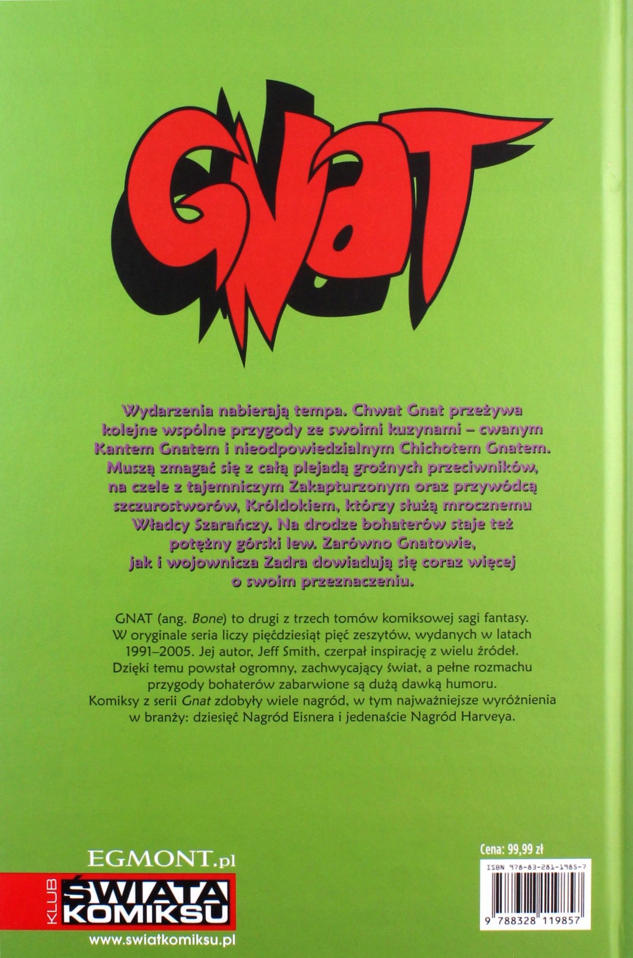 Drugi z trzech tomów przygodowej sagi fantasy. Wydarzenia nabierają tempa. Chwat Gnat przeżywa kolejne wspólne przygody ze swoimi kuzynami cwanym Kantem Gnatem i nieodpowiedzialnym Chichotem Gnatem. Muszą zmagać się z całą plejadą groźnych przeciwników, na czele z tajemniczym Zakapturzonym oraz przywódcąszczurostworów, Króldokiem, którzy służą mrocznemu Władcy Szarańczy. Na drodze bohaterów staje też potężny górski lew. Zarówno Gnatowie, jak i wojownicza Zadra dowiadują się coraz więcej o swoim przeznaczeniu.W oryginale seria Gnat (oryg. Bone) liczy pięćdziesiąt pięć zeszytów, wydanych w latach 19912005. Jej autor, Jeff Smith, czerpał inspirację z wielu źródeł. Dzięki temu powstał ogromny, zachwycający świat, a pełne rozmachu przygody bohaterów zabarwione są dużą dawką humoru.Komiksy z serii Gnat zdobyły wiele nagród, w tym najważniejsze wyróżnienia w branży: dziesięć Nagród Eisnera i jedenaście Nagród Harveya.