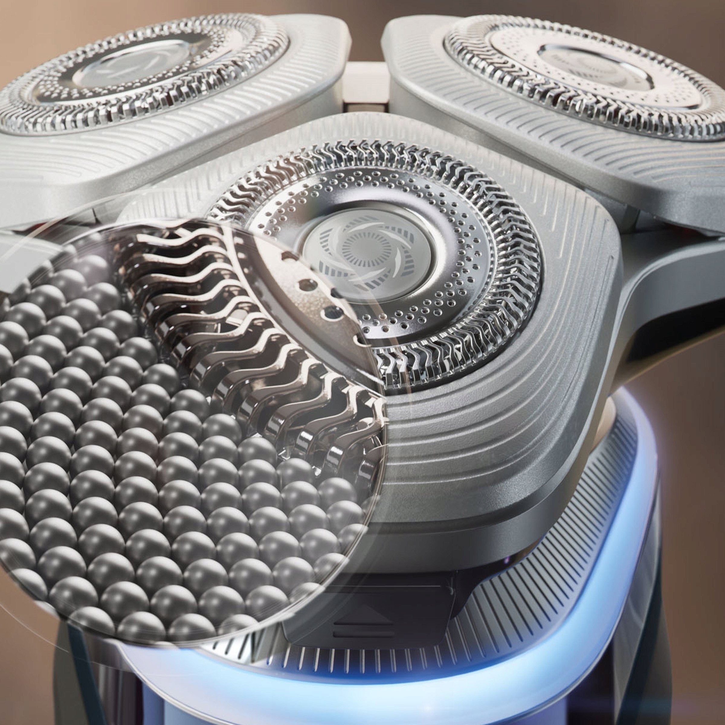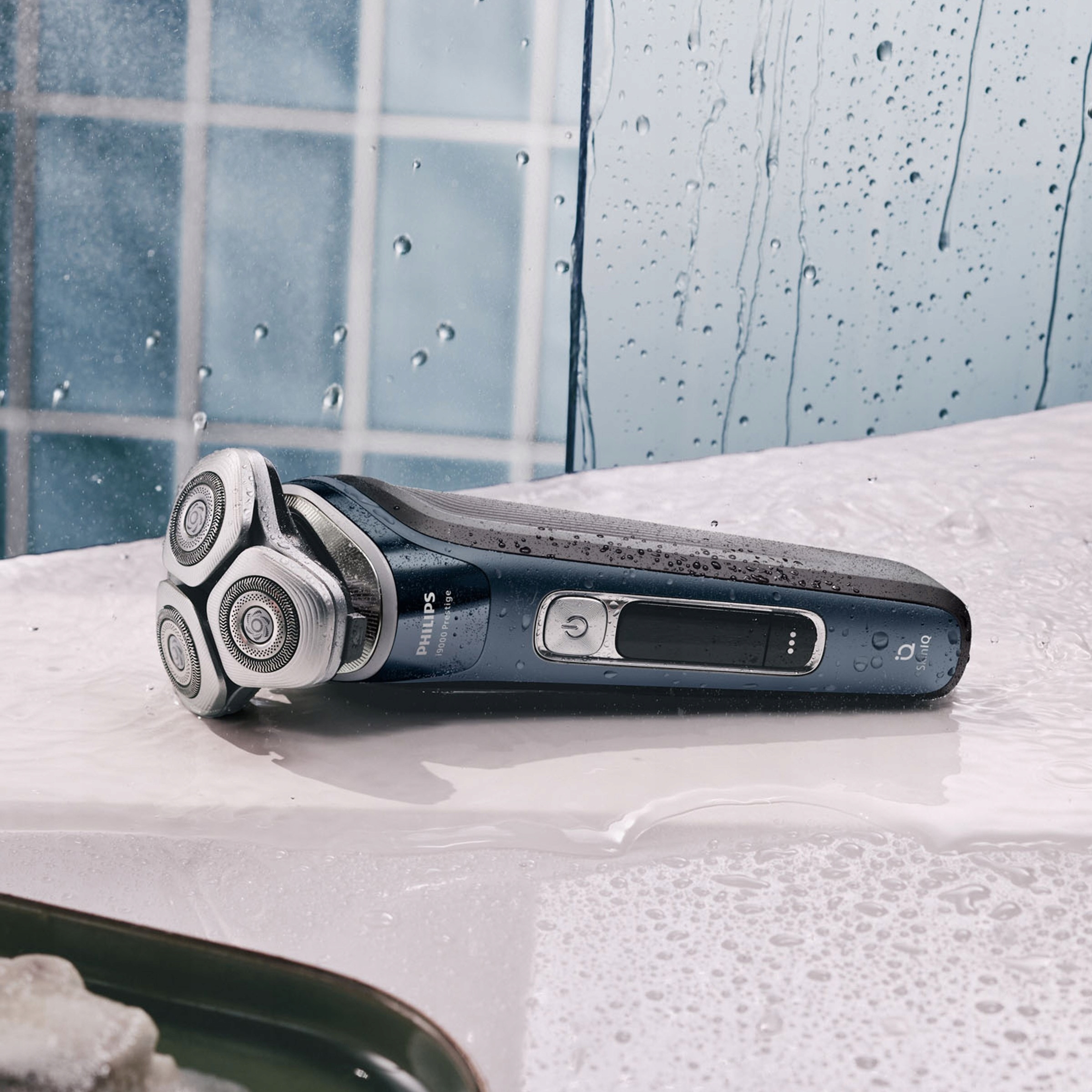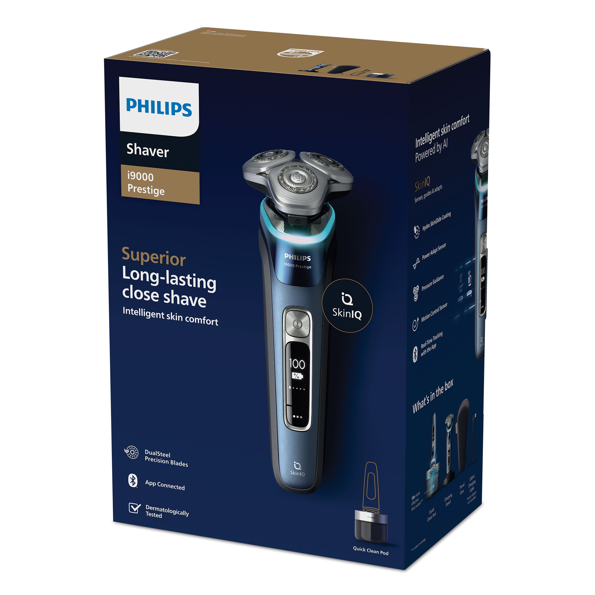 Urządzenie i9000 Prestige firmy Philips z systemem golenia Triple Action Lift&Cut i kompaktową głowicą 360 stopni Precision Flexing umożliwia strzyżenie włosów na poziomie skóry, nawet w trudno dostępnych miejscach. Oparta na sztucznej inteligencji technologia SkinIQ wyczuwa stan skóry i dopasowuje ustawienia, by zapewnić jej komfort.