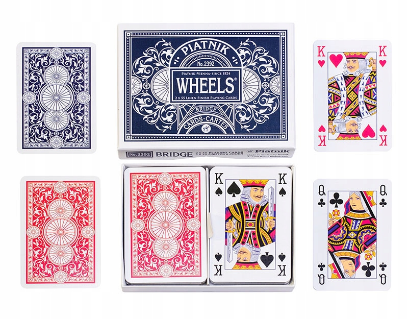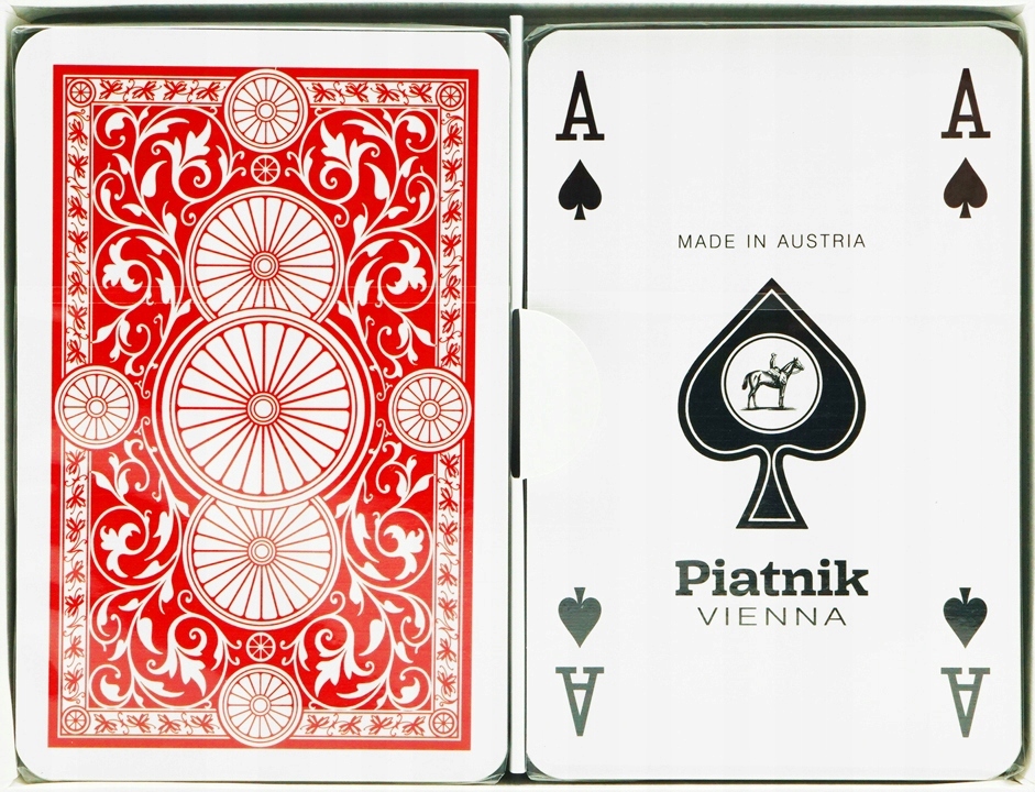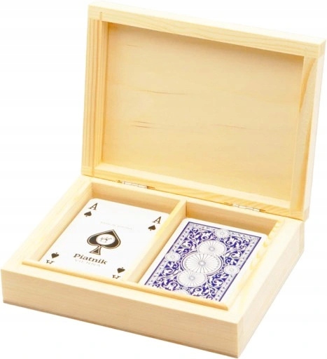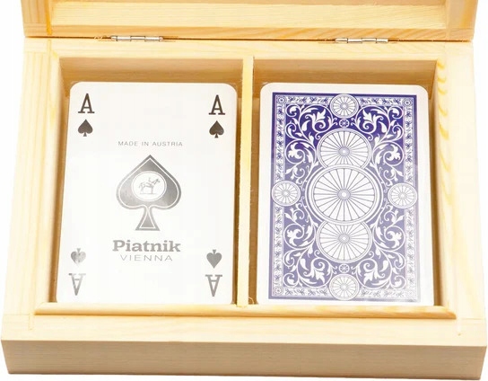 Już są! Wyczekane i jak zawsze dopracowane - podwójna (prezentowa! Karty o płótnowanej fakturze, bardzo popularne wśród polskich odbiorców. Talie składają się z 2 talii plastikowanych kart o wymiarach 58 x 89 mm i gramaturze 310. Idealne zarówno do brydża, pokera, remika jak i innych gier. Na odwrocie krótka historia tych kart i Piatnika po angielsku.