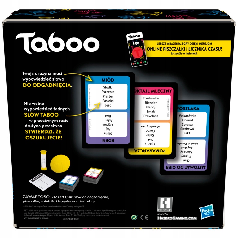 To gra pełna niewypowiedzianych słów! W grze Taboo gracze muszą sprawić, by ich drużyna odgadła tajemnicze słowo, nie wypowiadając przy tym żadnego z zakazanych wyrazów znajdujących się na karcie! Kto sprawi, że członkowie drużyny powiedzą "sława", nie mówiąc "celebryta", "supergwiazda", "musical", "znany" lub "fortuna"? Towarzyska gra Taboo zawiera 212 kart z 848 słowami do odgadnięcia o tematyce popkultury, trendów i nie tylko. Gracze próbują używać kreatywnych i ostrożnie dobranych podpowiedzi, aby pomóc członkom swoich drużyn jak najszybciej odgadnąć słowa i zdążyć przed upływem czasu. Gdy tylko wspomną o zakazanych słowach, usłyszą piszczałkę i stracą punkt. Ta zabawna gra imprezowa dla dorosłych i nastolatków w wieku od 13 lat to ekscytujący wybór na rodzinny wieczór z grami, a także jedna z najlepszych gier towarzyskich! Rozmiar i kompaktowe pudełko sprawiają, że Taboo to idealna gra przenośna, którą można wziąć wszędzie tam, gdzie ma się na to ochotę. Dodatkową opcją jest aplikacja, która pomaga mierzyć czas na odgadywanie.