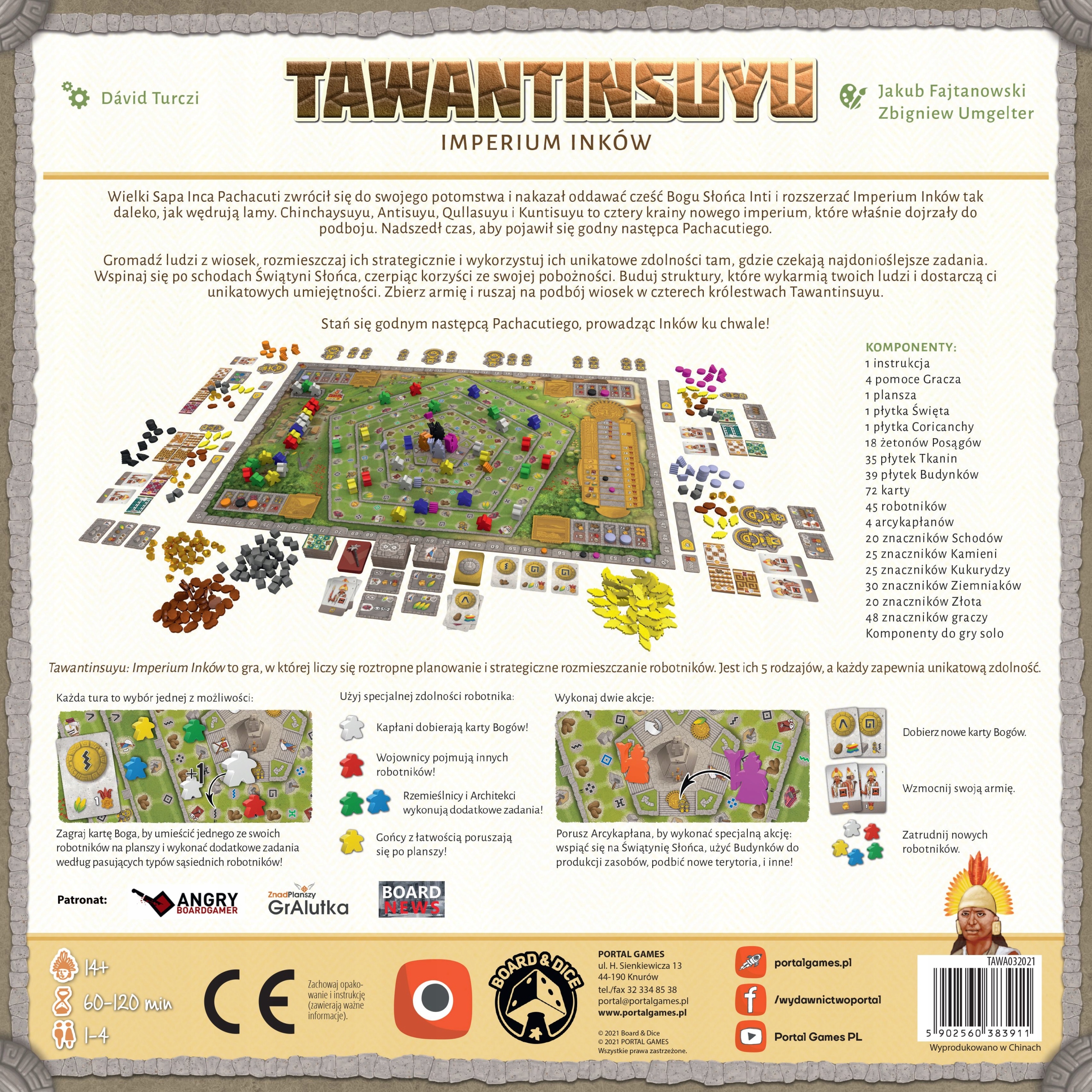 Tawantinsuyu: Imperium Inków to rozbudowana strategiczna gra euro Dávida Turcziego (Tekhenu: Obelisk Słońca, Anachrony), oferująca mechanikę rondla, zarządzanie robotnikami i wariant solo. Staniecie na czele inkaskich plemion, które będą zbierać zasoby, budować i walczyć z sobą o przejęcie schedy po legendarnym władcy, Pachacutecim. To kolejna gra, obok takich tytułów jak Teotihuacan czy Tzolkin, bazująca na klimatach starożytnych plemion Ameryki Południowej.