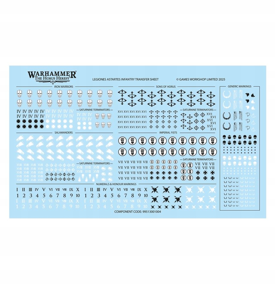 Zawartość zestawu: 224 plastikowe elementy, 4x okrągłe podstawki Citadel 50mm oraz 1x arkusz kalkomanii Legiones Astartes Infantry z 618 wysokiej jakości wodnymi naklejkami (Sons of Horus, Imperial Fists, Iron Warriors, Salamanders). Modele wymagają złożenia i pomalowania – farby, klej i narzędzia nie są dołączone.