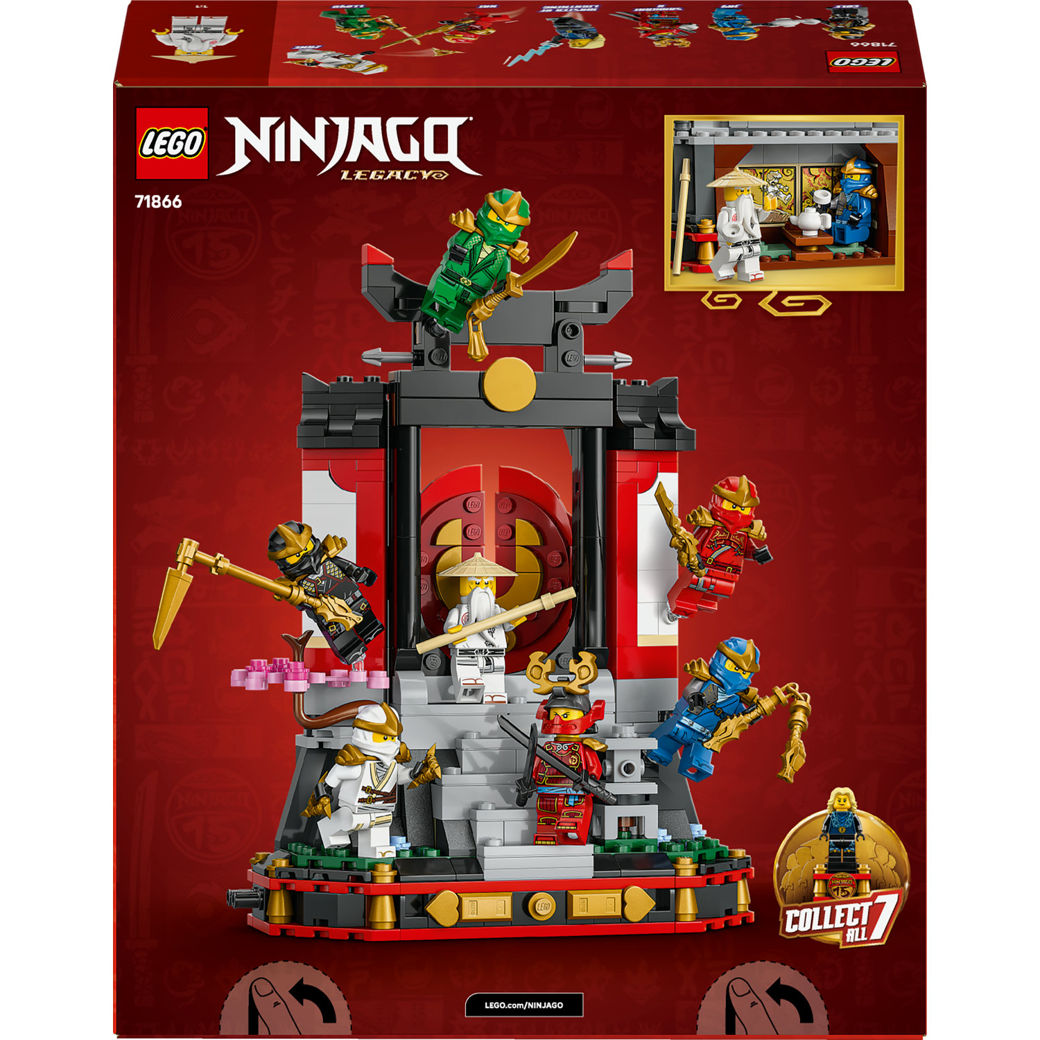Dziewczyny, chłopcy i wszyscy fani ninja z nostalgią, w wieku od 14 lat, mogą świętować 15. rocznicę serialu LEGO® NINJAGO® dzięki zestawowi Nindża wystawa: 15 lat NINJAGO (71866), który **zawiera** 8 minifigurek. Ten fantastyczny zestaw z klasztorem ninja zawiera schody, otwieraną bramę, kamienną latarnię, kwitnącą wiśnię i herbaciarnię z tyłu z naklejkami przedstawiającymi słynną bitwę z serialu NINJAGO.