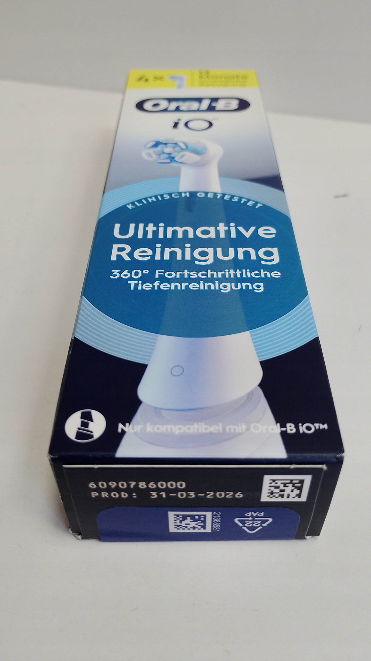 Wymienne końcówki do szczoteczek Oral-B iO Ultimate Clean łączą silne, lecz delikatne mikrowibracje z wyjątkową okrągłą końcówką szczoteczki, zaprojektowaną we współpracy z dentystami, zapewniając profesjonalne uczucie czystości każdego dnia. Końcówki Ultimate Clean, stworzone specjalnie z myślą o rączkach szczoteczek elektrycznych Oral-B iO, pomagają usuwać nawet do 100% więcej płytki bakteryjnej niż zwykła szczoteczka manualna, pozostawiając zęby czyste i lśniące. Włókna są ułożone w pęczki i precyzyjnie ustawione pod kątem 16 stopni, dzięki czemu pomagają czyścić trudno dostępne miejsca w jamie ustnej. Ponieważ dentyści zalecają wymianę końcówki szczoteczki co 3 miesiące w celu uzyskania najlepszych rezultatów, wymienne końcówki szczoteczek Oral-B mają zmieniające kolor włókna, które stopniowo blakną i stają się białe, sygnalizując, że nadszedł czas na wymianę. Uzyskaj najwyższą moc czyszczenia dzięki jedynej końcówce wymiennej zaprojektowanej specjalnie z myślą o szczoteczce elektrycznej Oral-B iO i zapewniającej optymalne dopasowanie do niej.