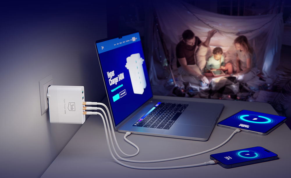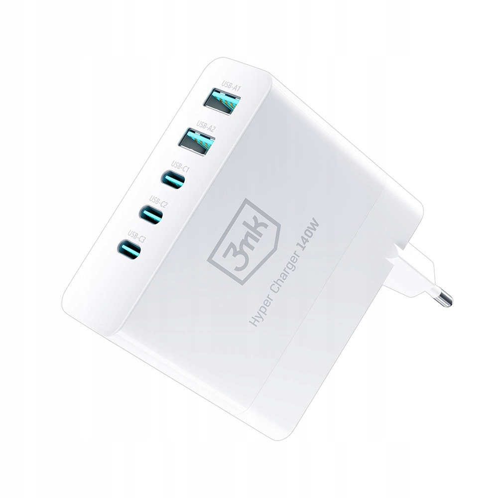 3mk Hyper Charger 140W to rozwiązanie dla najbardziej wymagających użytkowników. Dzięki pięciu portom (2× USB-A i 3× USB-C) umożliwia jednoczesne ładowanie kilku urządzeń – od smartfonów po laptopy. Maksymalna łączna moc 140 W, wspierająca technologie Quick Charge i Power Delivery, zapewnia ultraszybkie i skuteczne ładowanie, niezależnie od urządzenia.