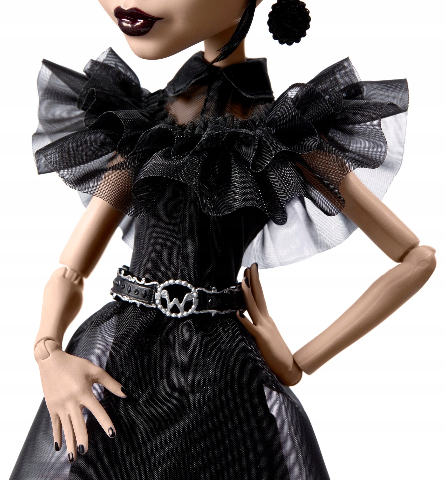 Cóż za noc! Ta modowa lalka kolekcjonerska Wednesday Rave'N to kwintesencja gotyckiej elegancji w sukni vintage mrocznej niczym najczarniejsza noc, inspirowanej kultową sceną tańca z serialu. Suknia o półprzezroczystych warstwach organzy jest czarna jak poczucie humoru jej właścicielki. Ten upiornie stylowy strój uzupełniają oryginalny pasek i kolczyki Monster High.