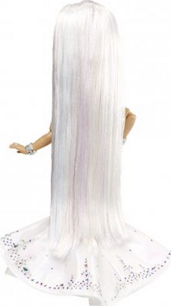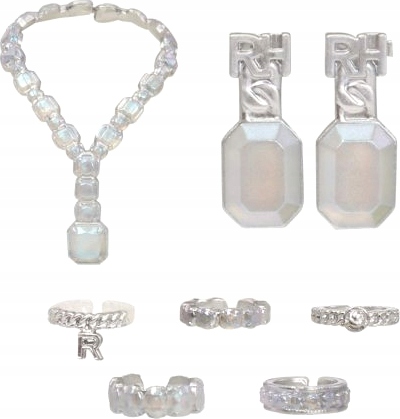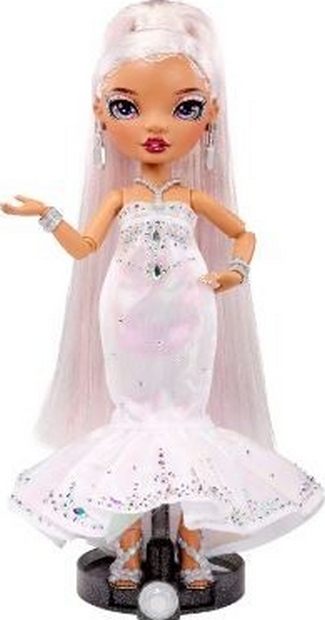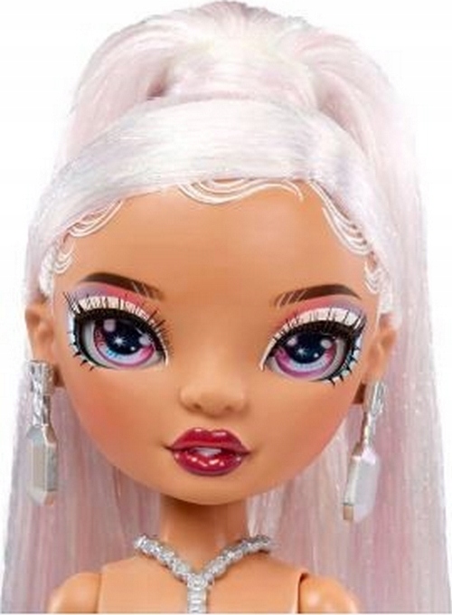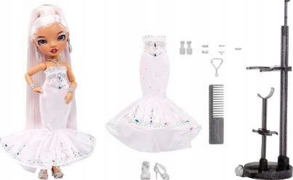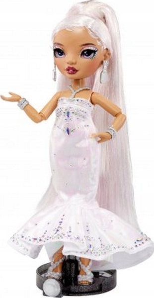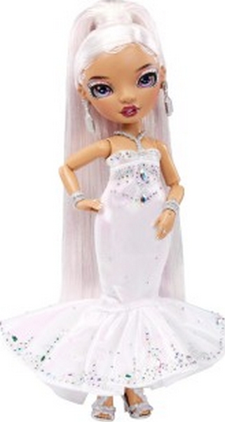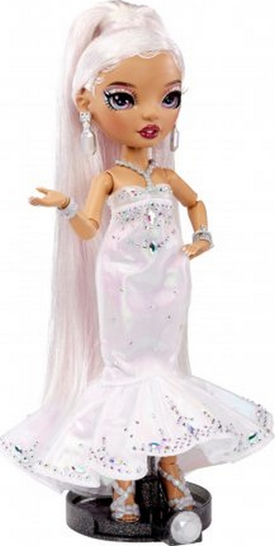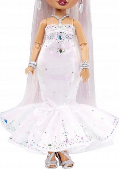 Modna lalka Roxie Grand ma na sobie opalizującą sukienkę z organzy ozdobioną dżetami, a do tego diamentową biżuterię i wysadzane klejnotami buty na obcasie.