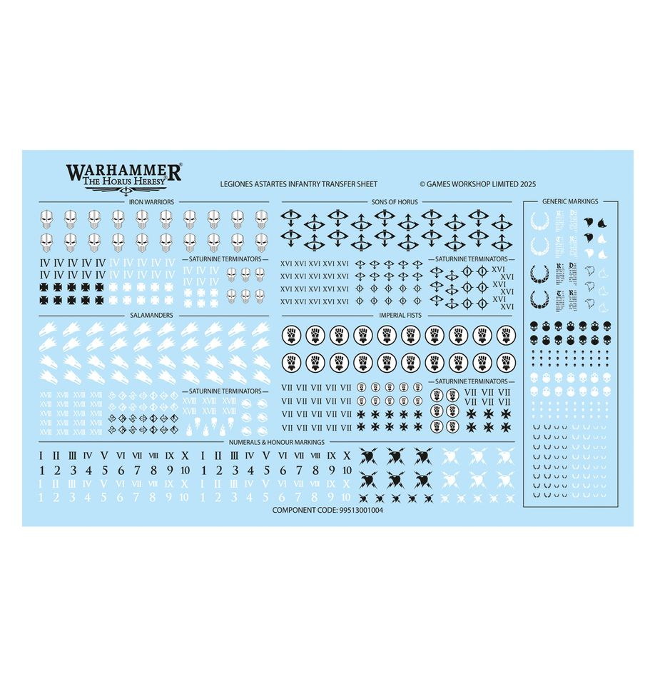 Ten zestaw zawiera 344 plastikowe elementy, 20 okrągłych podstawek Citadel 32 mm i 1 arkusz kalkomanii piechoty Legionu Herezji Horusa zawierający 618 wysokiej jakości kalkomanii wodnych – z ikonografią Legionu dla Synów Horusa, Imperialnych Pięści, Żelaznych Wojowników i Salamander – do ozdabiania twoich miniatur.