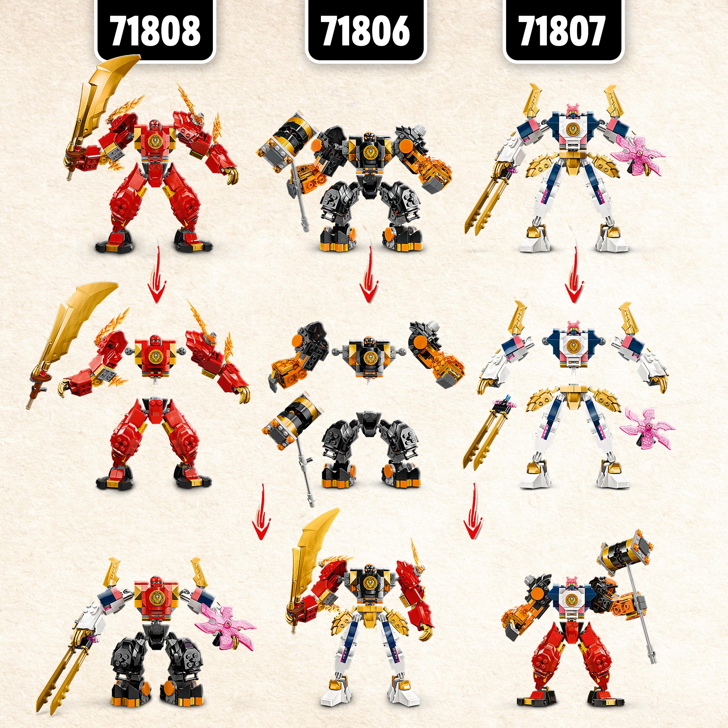 Mech do przebudowywania pozwala dzieciom zbudować własnego mecha! Jego odłączane nogi, ręce i tułów można połączyć z częściami dwóch innych mechów: Mecha żywiołu ziemi Cole’a (71806) i Mecha żywiołu technologii Sory (71807) (sprzedawanych osobno). Mieszanie i dopasowywanie części może zapewnić dzieciom wiele godzin świetnej zabawy, podczas której stworzą unikatową figurkę.