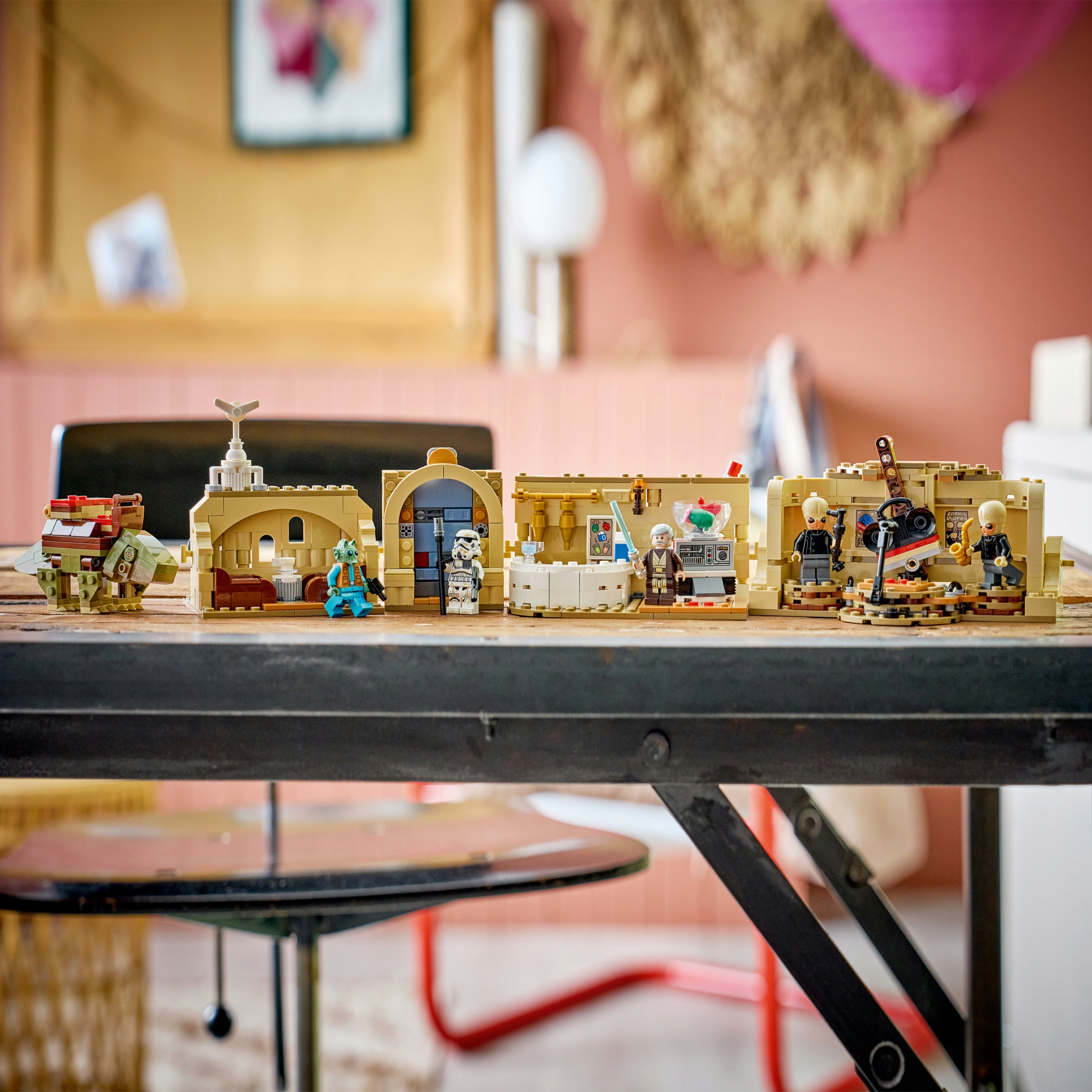 Dołącz do gwarnego tłumu w kantynie Mos Eisley LEGO® Star Wars™ (75425) dzięki temu zestawowi konstrukcyjnemu, który sprawdzi się jako prezent dla chłopców, dziewczynek i fanów Gwiezdnych Wojen w wieku od ośmiu lat. Ten szczegółowy model słynnej kantyny do zbudowania z klocków można podzielić na cztery moduły, co ułatwia zabawę. Uruchom kanapowe wyrzutnie, aby wystrzelić minifigurkę LEGO Star Wars, przygotuj napój w barze, dołącz do zespołu, aby zatańczyć na scenie, i wybierz się na przejażdżkę dewbackiem.