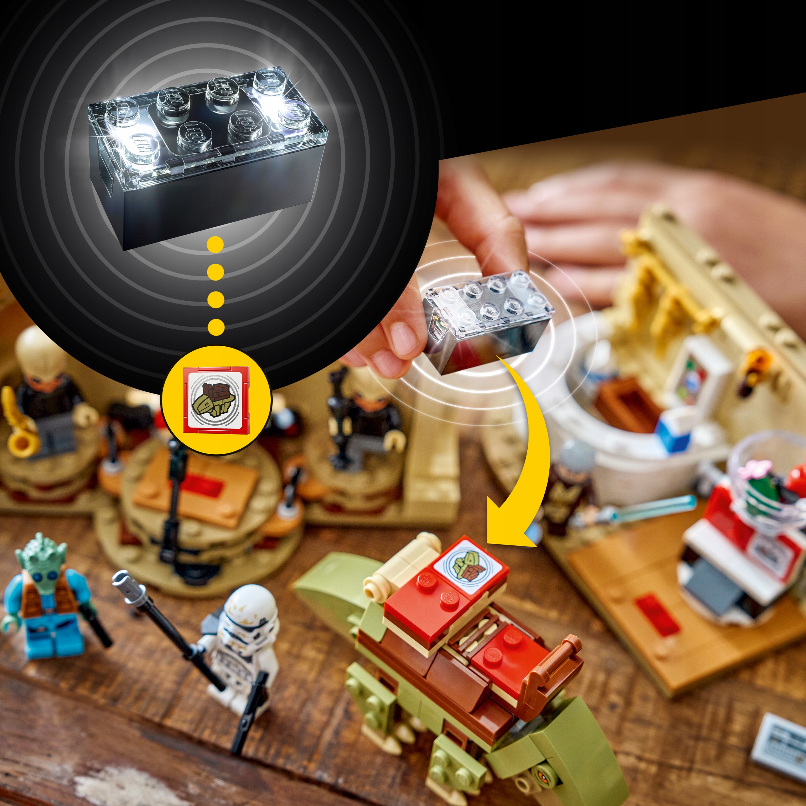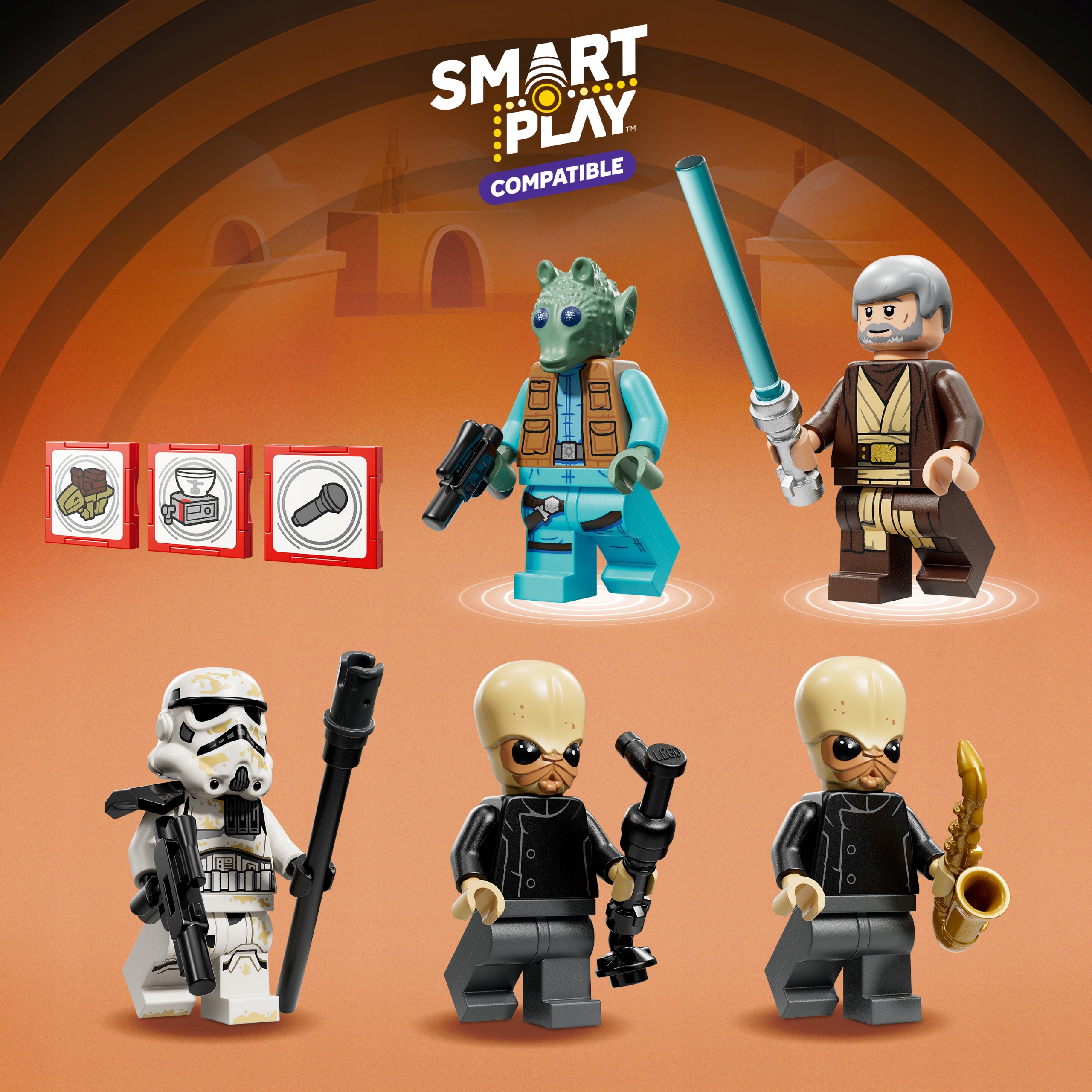 Ten zestaw kompatybilny z systemem LEGO SMART Play™ zawiera dwie SMART minifigurki LEGO — SMART Obi-Wana Kenobiego i SMART Greedo — oraz trzy SMART Tagi. Dodaj SMART klocek z zestawów Wszystko w jednym 75421, 75423 lub 75427 (sprzedawanych oddzielnie), aby aktywować interaktywną muzykę, śpiew i dźwięki, odgłosy chodzenia i spania dewbacka, odgłosy mieszania napojów, siorbania i wiele innych.