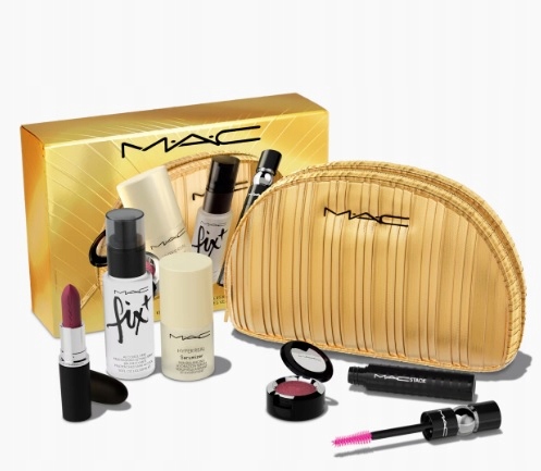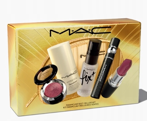 Pięcioczęściowy, ekskluzywny, świąteczny zestaw upominkowy kosmetyków do oczu, ust i skóry zawierający bestsellerowe produkty M·A·Cximal Silky Matte Lipstick, Dazzleshadow Extreme, M·A·CStack Mascara, Fix+ / Mini M·A·C oraz mini Hyper Real Serumizer™ w złotej cenie.