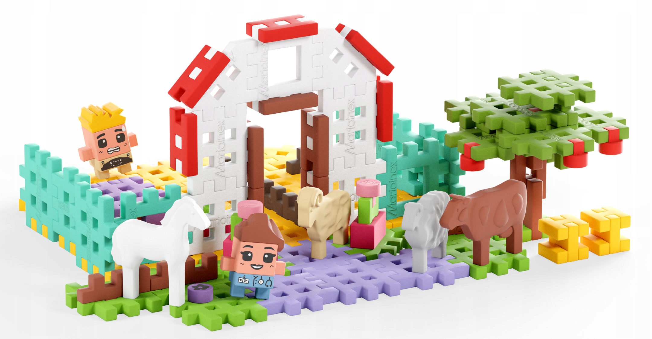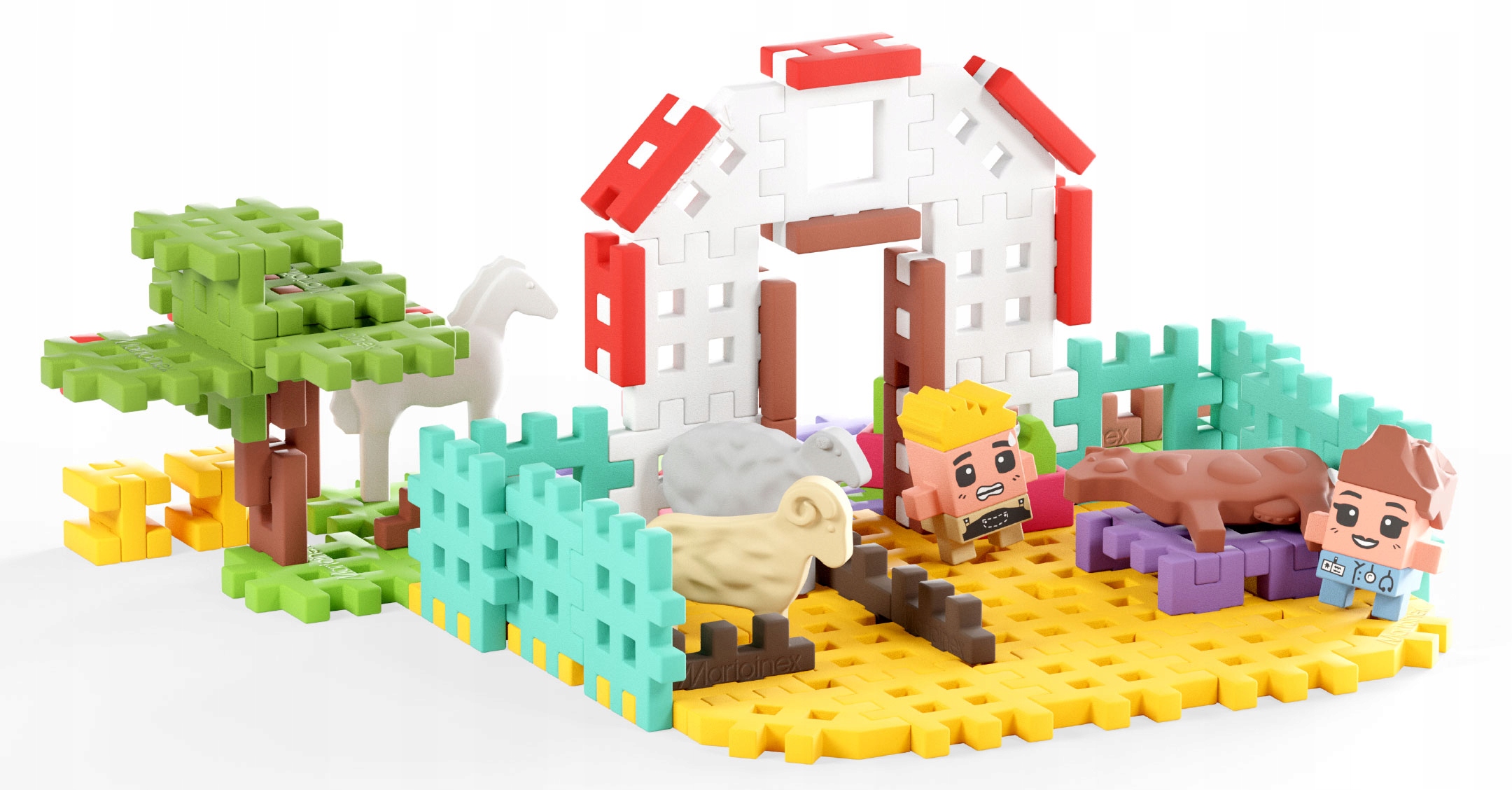 W zestawie znajduje się 100 elastycznych, kolorowych elementów, z których można zbudować gabinet weterynaryjny, wygodne łóżko, ogrodzenie oraz fragment farmy z drzewami i zwierzętami. Dzięki przemyślanej konstrukcji i detalom, dzieci mogą odgrywać realistyczne scenki z życia farmowego ośrodka zdrowia.