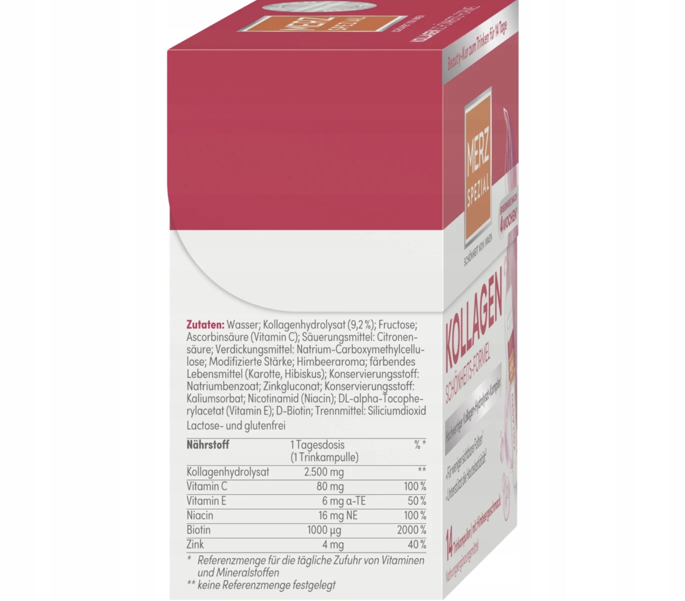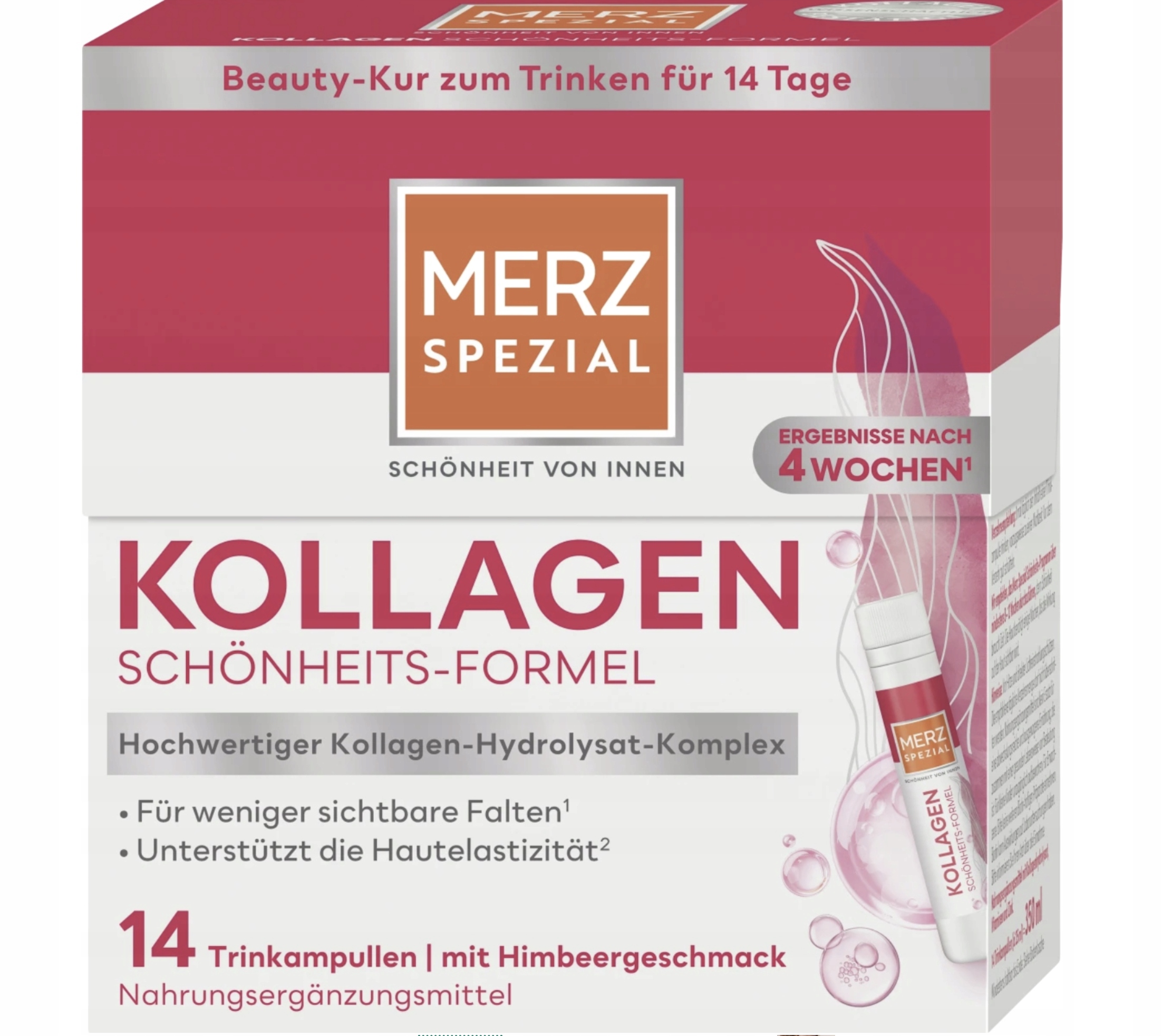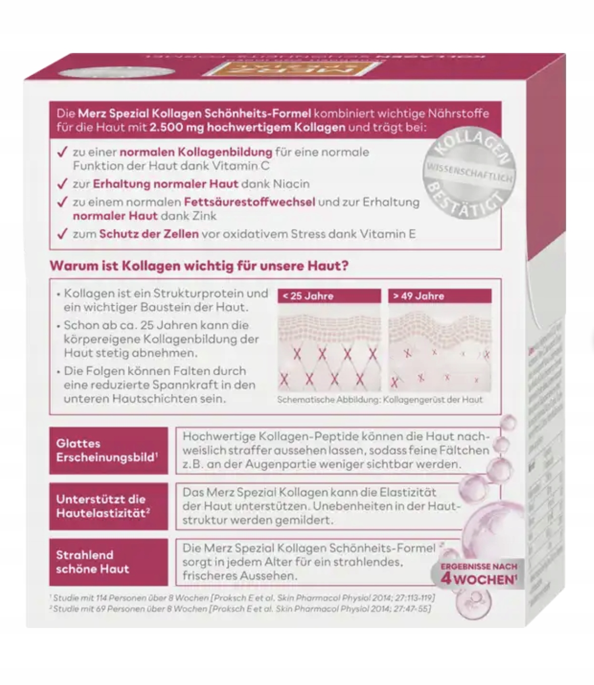 Wyjątkowa kolagenowa formuła pielęgnacyjna Merz zawiera specjalną kombinację wysokiej jakości peptydów kolagenowych i kluczowych, synergicznie działających składników odżywczych dla skóry. Kolagen w sposób szczególny wnika do głębszych warstw skóry i znacząco poprawia jej elastyczność oraz ujędrnia skórę od wewnątrz. Widocznie wygładza skórę. Drobne zmarszczki zostają wyraźnie wygładzone. Redukuje głębsze zmarszczki – do 20% po 8 tygodniach.