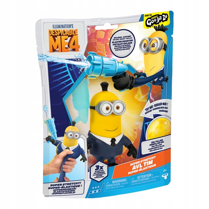 Niektóre z Minionków z filmu „Jak ukraść księżyc 4” dołączyły teraz do drużyny Bohaterów Goo Jit Zu i stały się supermiękkimi, rozciągliwymi figurkami do zabawy pełnej akcji! Tak jest! Dlatego Agent Tim z Ligii Antyprzestępczej (AVL) przejął ich niezwykłe moce i jest teraz dostępny w mięciutkiej, rozciągliwej i kleistej wersji! Zobacz go w formie, jakiej nigdy wcześniej nie miał!