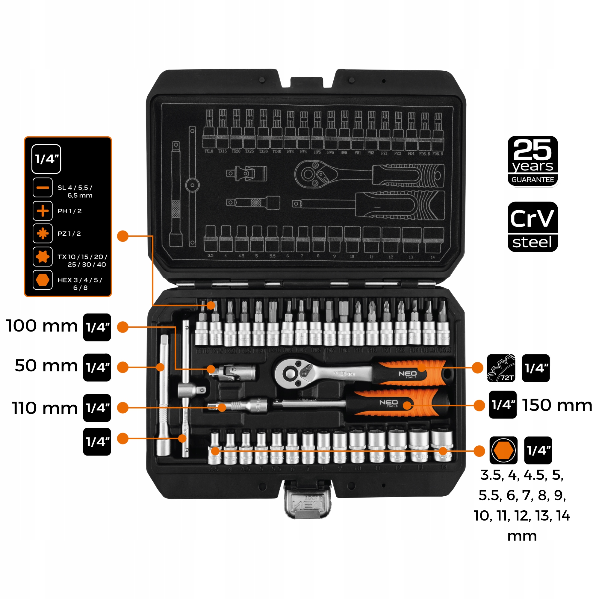 Grzechotka 72-zębna 1/4” zapewnia płynną pracę nawet w ograniczonej przestrzeni. Nasadki i bity pozwalają na obsługę różnych typów śrub – od płaskich, krzyżakowych, przez Torx, aż po sześciokątne. To wszystko umieszczono w poręcznej, kompaktowej walizce.