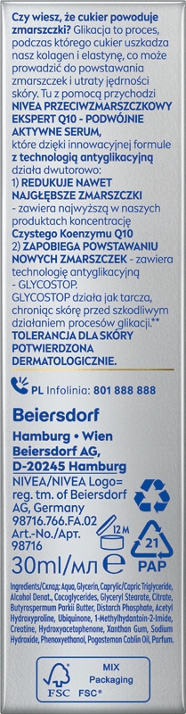 Czy wiesz, że cukier powoduje zmarszczki? Glikacja to proces, podczas którego cukier uszkadza kolagen i elastynę, co może prowadzić do powstawania zmarszczek i utraty jędrności skóry. NIVEA PRZECIWZMARSZCZKOWY EKSPERT Q10 - PODWÓJNIE AKTYWNE SERUM dzięki innowacyjnej formule z technologią antyglikacyjną działa dwutorowo: REDUKUJE NAWET NAJGŁĘBSZE ZMARSZCZKI - zawiera najwyższą w naszych produktach koncentrację Czystego Koenzymu Q10 ZAPOBIEGA POWSTAWANIU NOWYCH - zawiera technologię antyglikacyjną z GLYCOSTOP, który działa jak tarcza, chroniąc skórę przed szkodliwym działaniem procesów glikacji.** PODWÓJNIE AKTYWNE SERUM jest 4x* silniejsze w połączeniu z przeciwzmarszczkowym kremem Q10 na dzień.