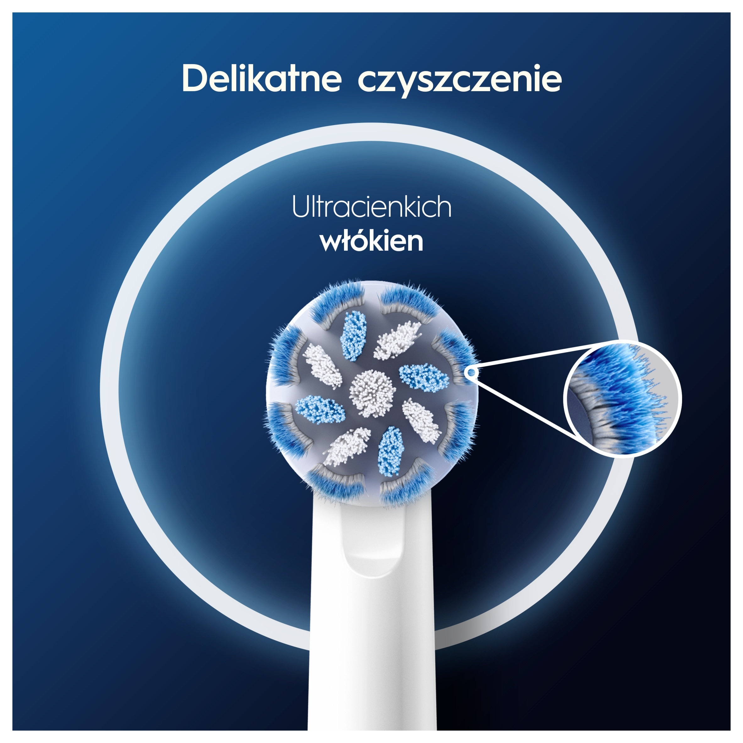 Doskonale znana okrągła końcówka szczoteczki Oral-B dokładnie otacza każdy ząb, łatwo czyszcząc nawet te obszary, które są trudno dostępne dla tradycyjnych, podłużnych szczoteczek, takich jak szczoteczki manualne lub soniczne. To dlatego czyści przestrzenie międzyzębowe 2x skuteczniej niż zwykła szczoteczka manualna. Końcówka Sensitive Clean jest wyposażona w ultracienkie włókna delikatne dla dziąseł oraz zwykłe włókna z zaokrąglonymi końcami, które są bezwzględne dla płytki bakteryjnej. Zgodnie z zaleceniami dentystów należy wymieniać końcówkę szczoteczki co trzy miesiące lub nawet częściej, jeżeli włókna są zużyte. Każdy szczegół i każde włókno zostały zaprojektowane we współpracy z dentystami, aby zapewnić wyjątkowo skuteczne czyszczenie. Końcówki wymienne do szczoteczek Oral-B pasują do całej gamy szczoteczek elektrycznych.