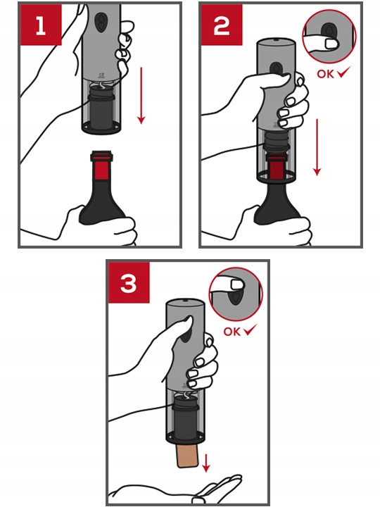 Drugie naciśnięcie górnej części przycisku spowoduje wyjęcie korkociągu z korka. Ten ładowalny elektryczny korkociąg jest dostarczany w etui z ładowarką.