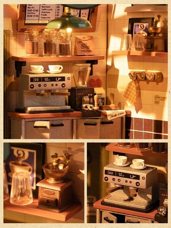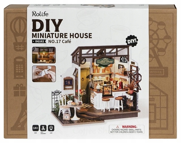 Chcesz zbudować kawiarnię z prawdziwego zdarzenia? Zestaw Robotime umożliwia samodzielne wykonanie przepięknego modelu kawiarenki, w której nie brak absolutnie żadnego wyposażenia - znajduje się tutaj lada z gablotką na ciasta, ekspres do kawy, blender, mnóstwo półek, wysokie krzesła barowe, a także okrągły stolik czy uchwyt na gazety, które można poczytać, pijąc pyszną, aromatyczną kawę. Zestaw typy DIY od Robotime stanie się więc doskonałym podarkiem dla dorosłych, ale też dla młodzieży powyżej 14. roku życia.