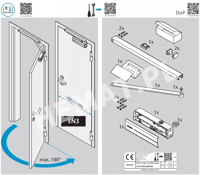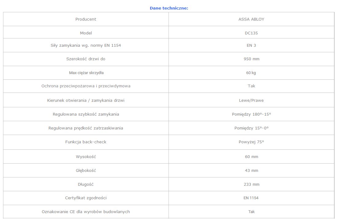 - samozamykacze DC 135 posiadają znak CE, dostępne są w kolorach: srebrny (EV1), biały, brązowy i czarny,