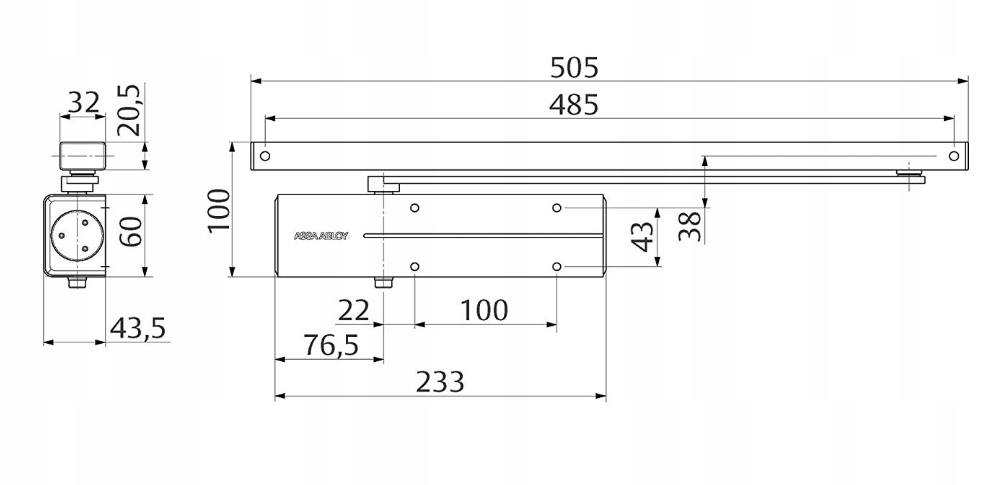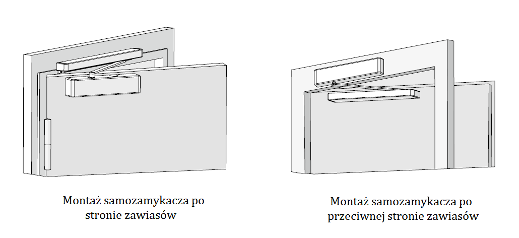 - montaż po stronie zawiasów (korpus na skrzydle, ramię na ościeżnicy) lub po przeciwnej stronie do zawias (korpus na ościeżnicy, ramię na skrzydle),