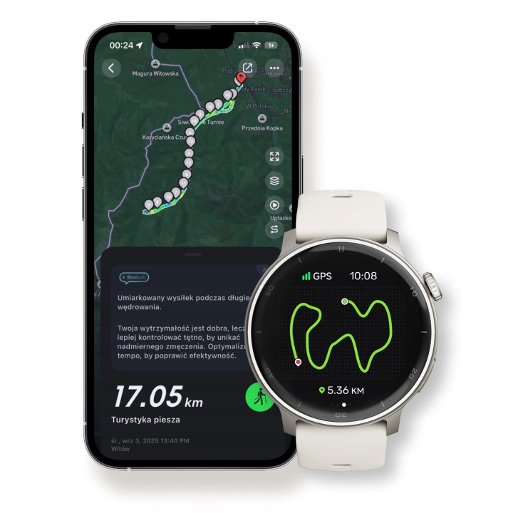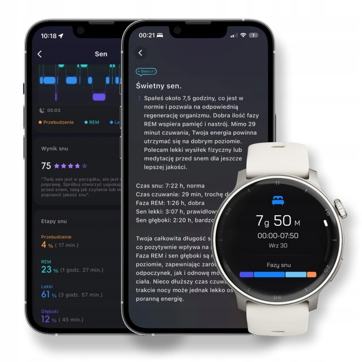 Ekran AMOLED, chipset ATS3085S, ponad 60 trybów sportowych oraz system STELIO AI wspierają trening i regenerację każdego dnia.