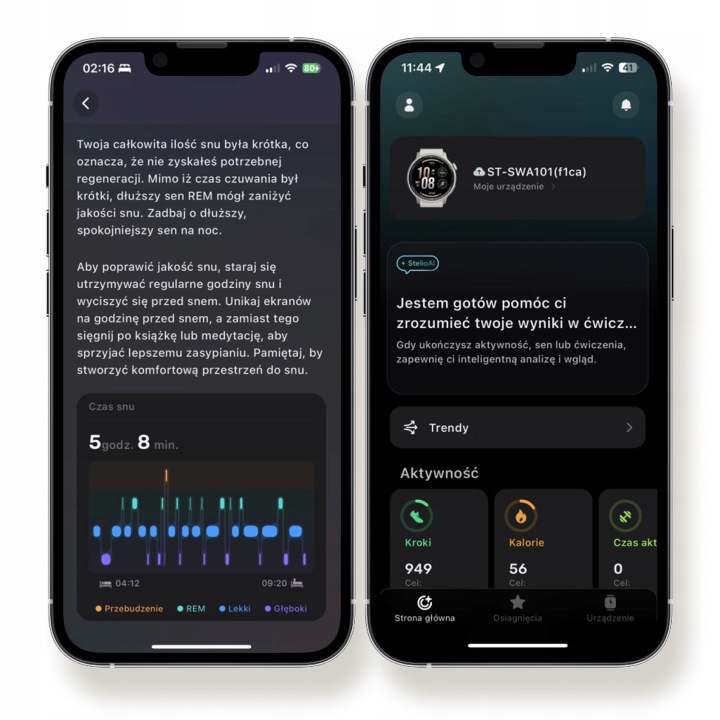 STELIO AI analizuje dane z treningu, snu i codziennej aktywności, generując czytelne raporty w aplikacji STELIO ACTIV oraz praktyczne wskazówki.