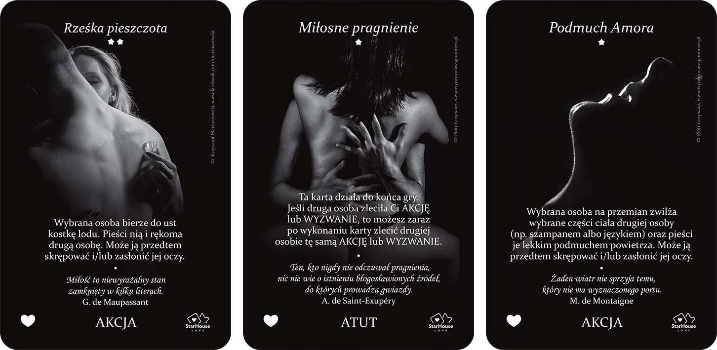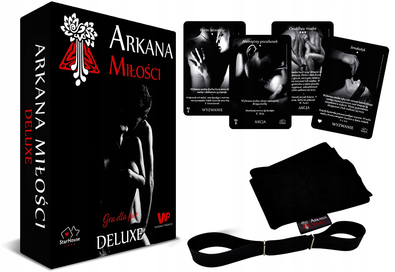 Arkana Miłości to seria ekskluzywnych gier erotycznych, które łączą proste zasady i zróżnicowane zadania pomagające przełamać nieśmiałość, budujące seksualne napięcie i wprowadzające szczyptę pikanterii do Waszego związku. Gra ma klimatyczną oprawę graficzną ze zdjęciami zmysłowych aktów pobudzających wyobraźnię, a także intrygującymi aforyzmami.