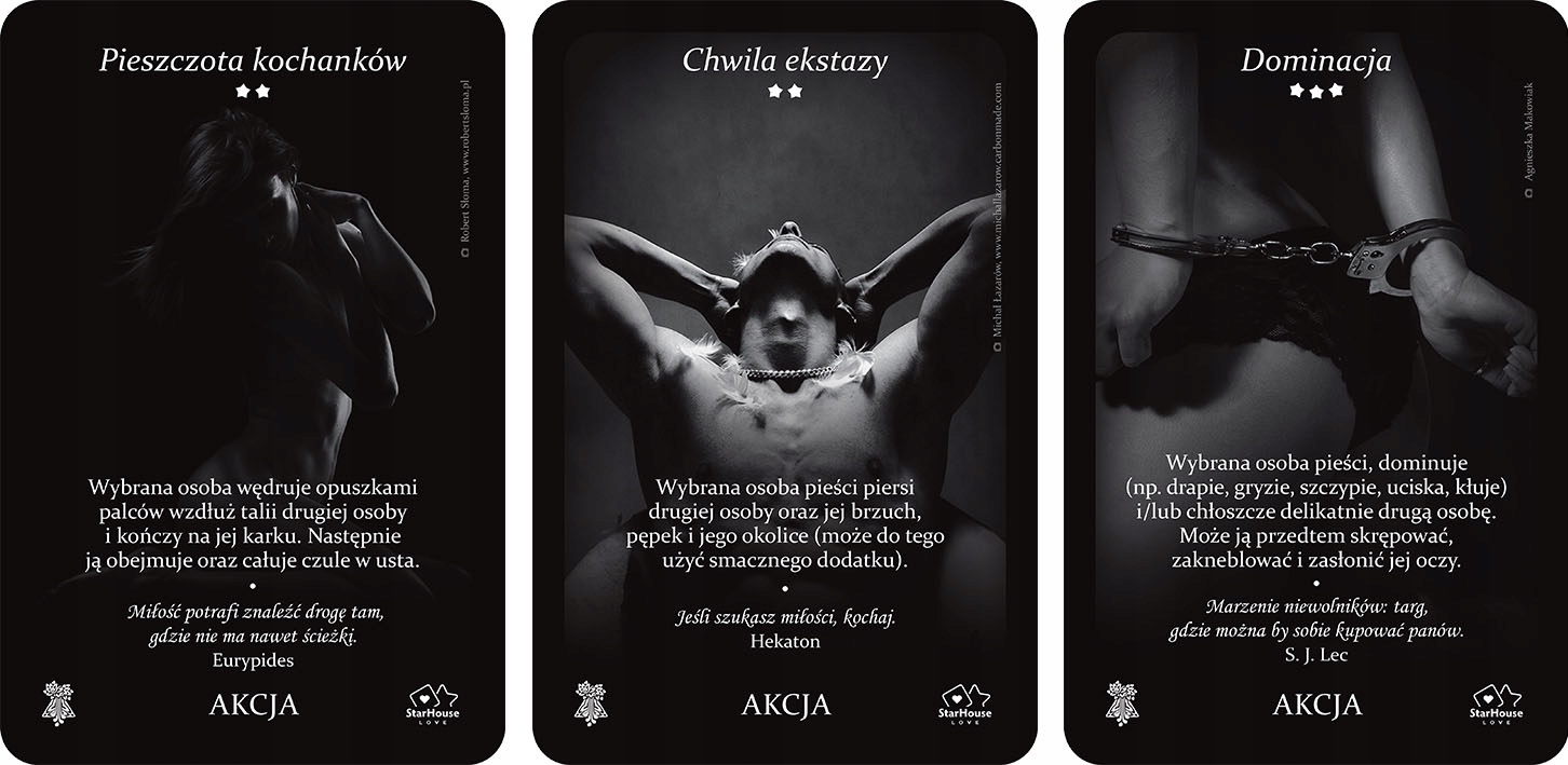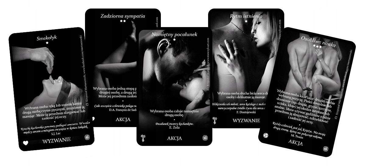W Edycji Deluxe znajdziesz 3 talie do gry, które można w dowolny sposób ze sobą łączyć, wybierając te karty, które nam odpowiadają, a także opaskę na oczy oraz kajdanki, dzięki którym będziecie mieli szansę na jeszcze intensywniejsze doznania.