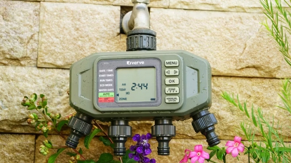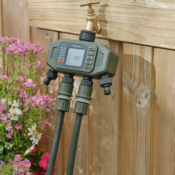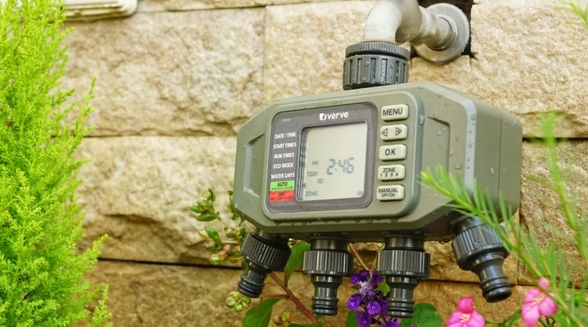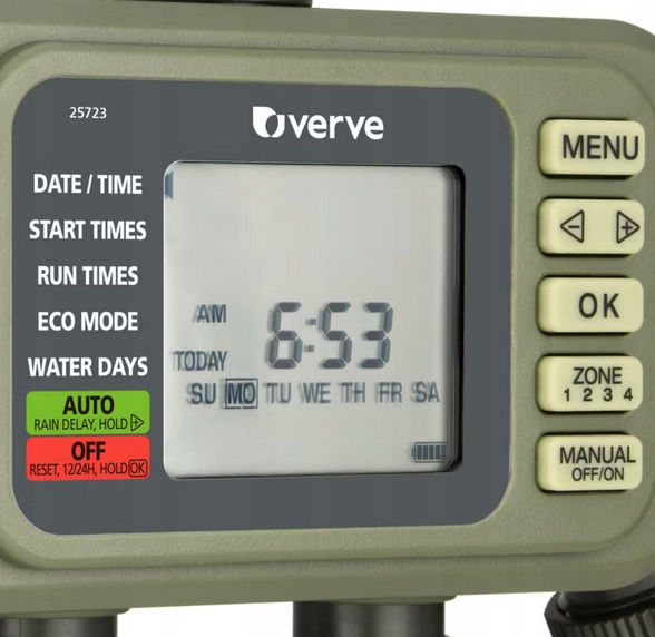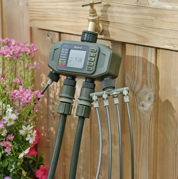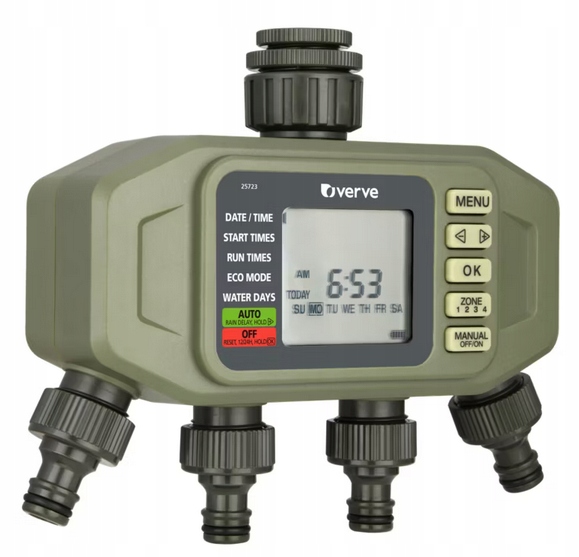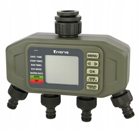 Sterownik nawadniania Verve umożliwia zautomatyzowanie systemu nawadniania w celu oszczędzania wody. Dostępne ustawienia częstotliwości podlewania umożliwiają dostosowanie do indywidualnych potrzeb. Rozwiązanie można także zastosować do systemów nawadniania natryskowego i kropelkowego. Model ma 4 wyjścia — każde z nich stanowi programowalną strefę. Dla każdej strefy można zaprogramować do 4 cykli nawadniania. Należy użyć dostarczonych przyłączy kranowych i wybrać odpowiedni rozmiar kranu. 5 przycisków funkcyjnych do łatwego programowania. 11 dostępnych ustawień częstotliwości podlewania. Czas podlewania od 1 min do 360 min na cykl. Duży, czytelny wyświetlacz LCD. Gdy produkt nie jest używany, zaleca się jego przechowywanie w chłodnym miejscu, zapewniającym ochronę przed mrozem i bezpośrednim światłem słonecznym.