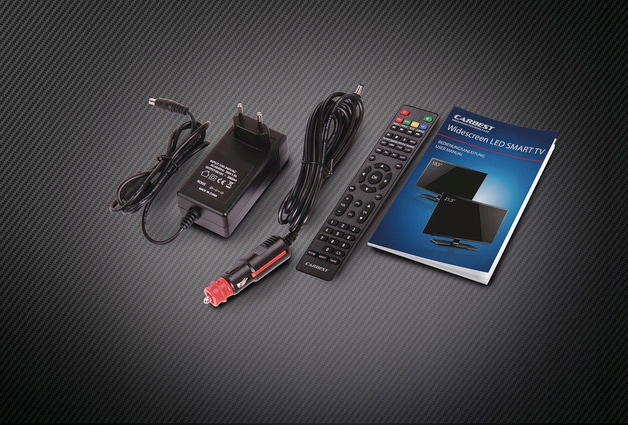 Telewizor LED, podstawa/podnóżek, zasilacz sieciowy 100-240V, zasilacz samochodowy 12-30V z wtyczką do zapalniczki, pilot, instrukcja