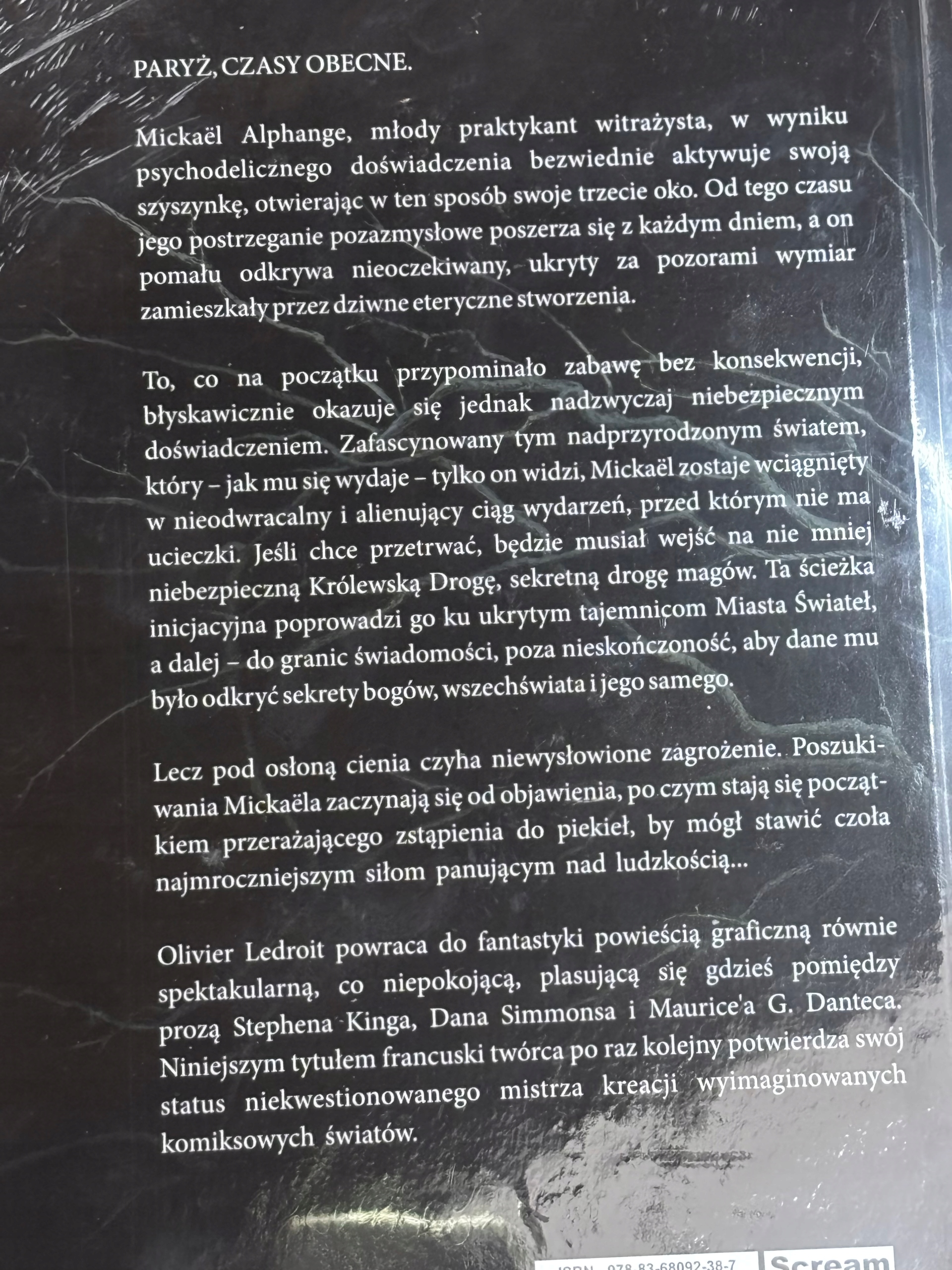 Drugi tom niezwykle entuzjastycznie przyjętej serii autorstwa Oliviera Ledroita. Mickal Alphange, młody praktykant witrażysta, poprzez doświadczenie psychodeliczne bezwiednie aktywuje swoją szyszynkę, otwierając w ten sposób swoje trzecie oko. Od tego czasu jego postrzeganie pozazmysłowe wzrasta i poszerza się z każdym dniem, a on pomału odkrywa nieoczekiwany, ukryty poza pozorami wymiar zamieszkały przez dziwne eteryczne stworzenia. To, co na początku przypominało zabawę bez konsekwencji, błyskawicznie okazuje się jednak nadzwyczaj niebezpiecznym doświadczeniem. Zafascynowany przez ten nadprzyrodzony świat, który jak mu się wydaje widzi jako jedyny, Mickal zostaje wciągnięty w nieodwracalny i wyobcowujący rozwój wydarzeń, przed którym nie może uciec. Jeśli chce przetrwać, będzie musiał wejść na nie mniej niebezpieczną Królewską Drogę, sekretną drogę magów. Ścieżkę inicjacyjną prowadzącą ku ukrytym tajemnicom Miasta Świateł, która zaprowadzi go na granice świadomości, poza nieskończoność, aby odkryć sekrety bogów, wszechświata i jego samego. Lecz pod osłoną cienia czyha niewysłowione zagrożenie. Poszukiwania Mickala zaczynają się od objawienia, po czym stają się początkiem przerażającego zstąpienia do piekieł, by stawić czoła najmroczniejszym siłom panującym nad ludzkością... Olivier Ledroit powraca do fantastyki powieścią graficzną równie spektakularną, co niepokojącą, plasującą się gdzieś pomiędzy prozą Stephena Kinga, Dana Simmonsa i Maurice#39;a G Danteca. Niniejszym tytułem francuski twórca po raz kolejny potwierdza swój status niekwestionowanego mistrza tworzenia wyimaginowanych komiksowych światów.