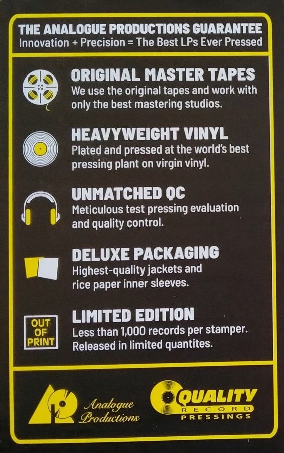 Mastered by Doug Sax using an all-tube system. Overseen by Bruce Botnick, The Doors producer/engineer. Two 45 rpm LPs pressed on 180-gram vinyl at Quality Record Pressings/Also on Hybrid Multichannel SACD. Part of The Doors reissue series proudly presented by Analogue Productions and Quality Record Pressings!