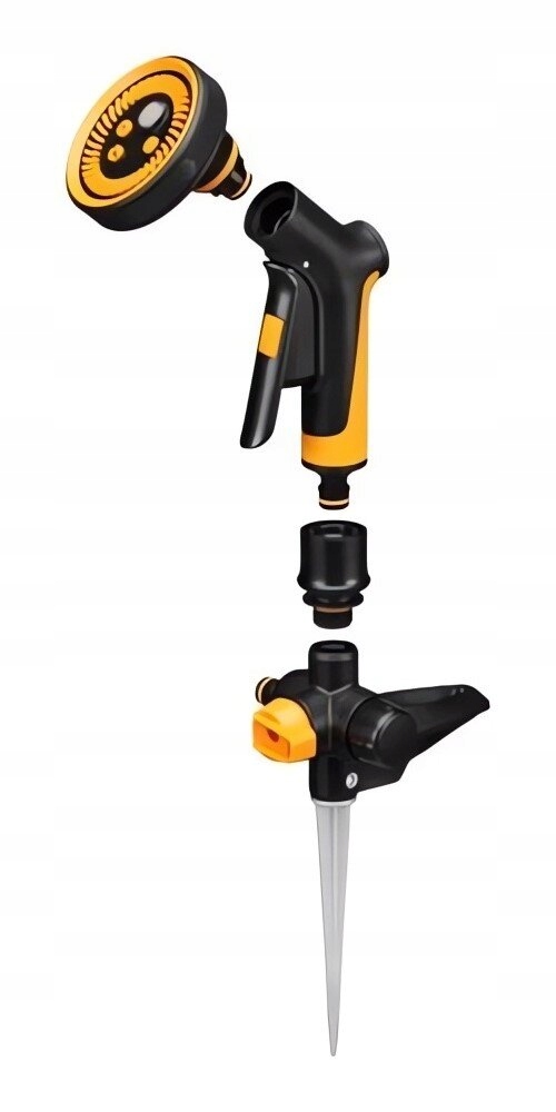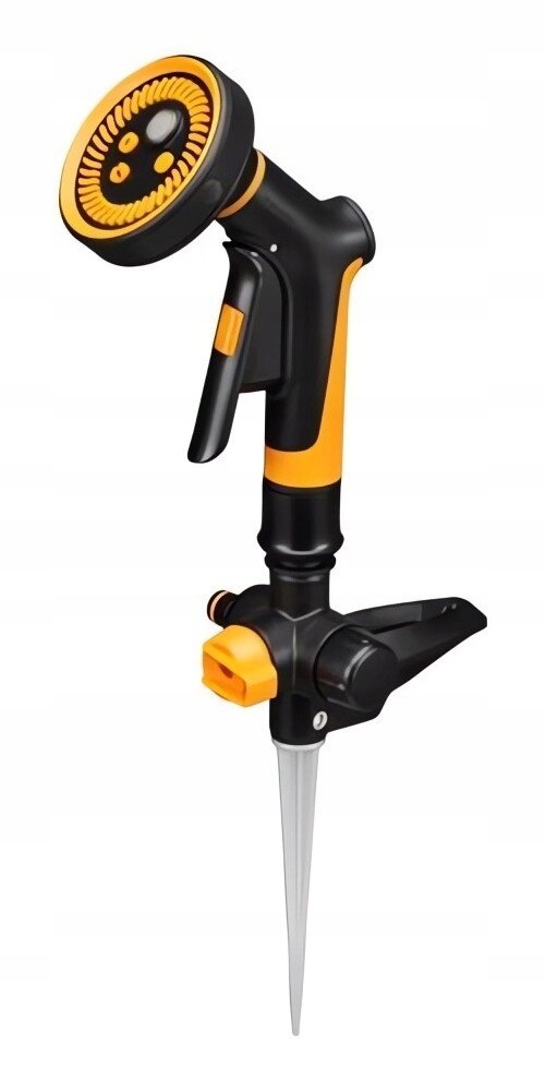 Zestaw startowy do precyzyjnego nawadniania Fiskars Comfort zawiera cztery elementy, które umożliwiają stworzenie idealnego zraszacza stacjonarnego do bardzo precyzyjnego podlewania lub do stosowania jako zwykły pistolet natryskowy. Uniwersalne szybkozłącze z gwintem 1/2" można podłączyć do dołączonej solidnej podstawy kolca uziemiającego lub do innych dostępnych na rynku podstaw zraszaczy. Szybkozłącze pasuje do dołączonego wielofunkcyjnego pistoletu natryskowego, a także innych pistoletów natryskowych z uniwersalnym szybkozłączem, dzięki czemu można je podłączyć do podstawy zraszacza. Wielofunkcyjny pistolet natryskowy posiada antypoślizgową głowicę natryskową, którą można obracać w celu wyboru spośród pięciu wzorów natrysku, mgiełki, prysznica, płaskiego, płukania i strumienia, a uchwyt pistoletu natryskowego jest łatwy w obsłudze za pomocą przedniego sterownika. Głowicę natryskową można bezstopniowo regulować i można ją zablokować w celu długotrwałego użytkowania. Podstawa zraszacza wyposażona jest w zawór włączający/wyłączający zapewniający dodatkową kontrolę podczas nawadniania. Zestaw zawiera adapter, podstawę zraszacza z kolcami, uchwyt pistoletu natryskowego i wielofunkcyjną głowicę natryskową.