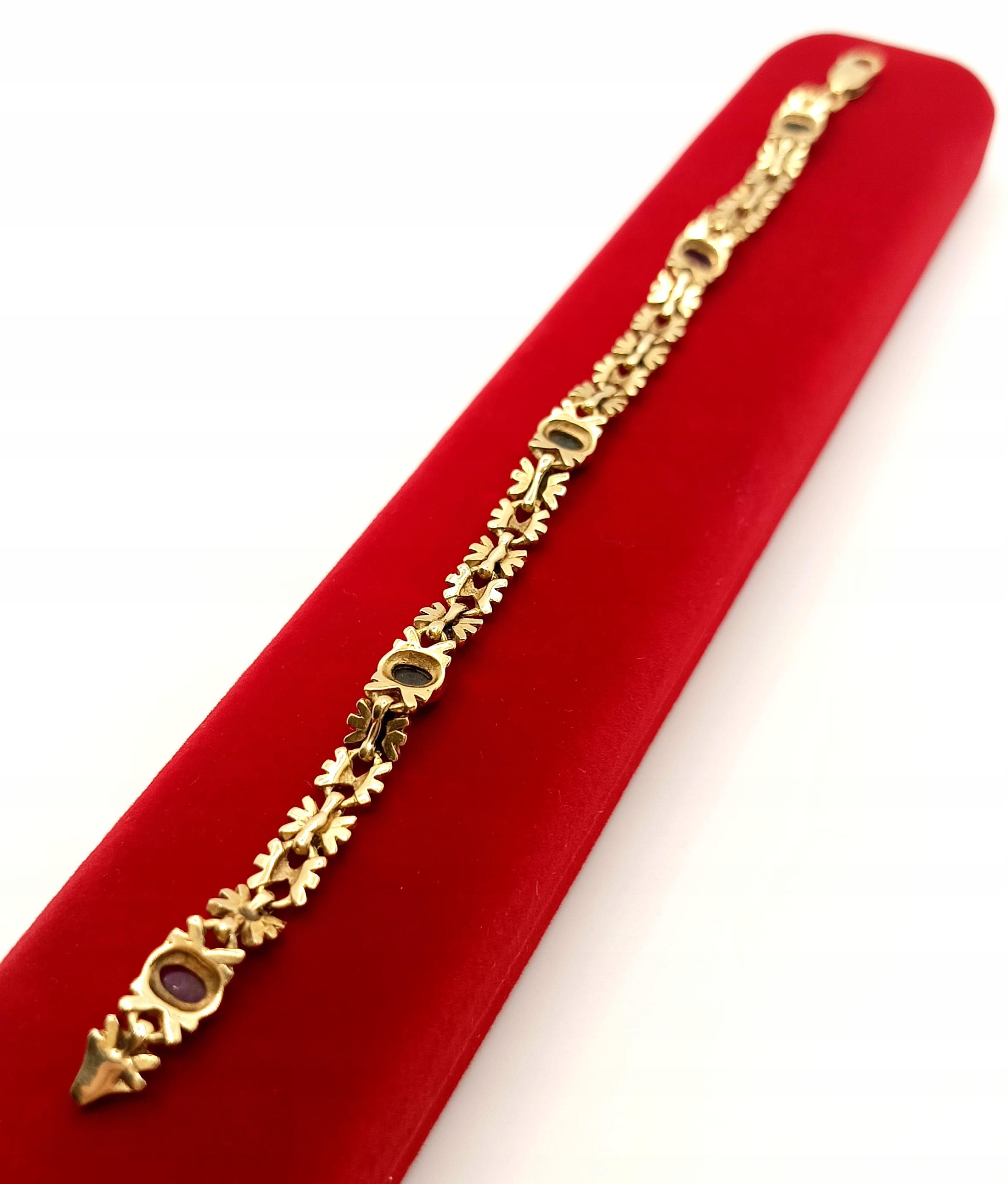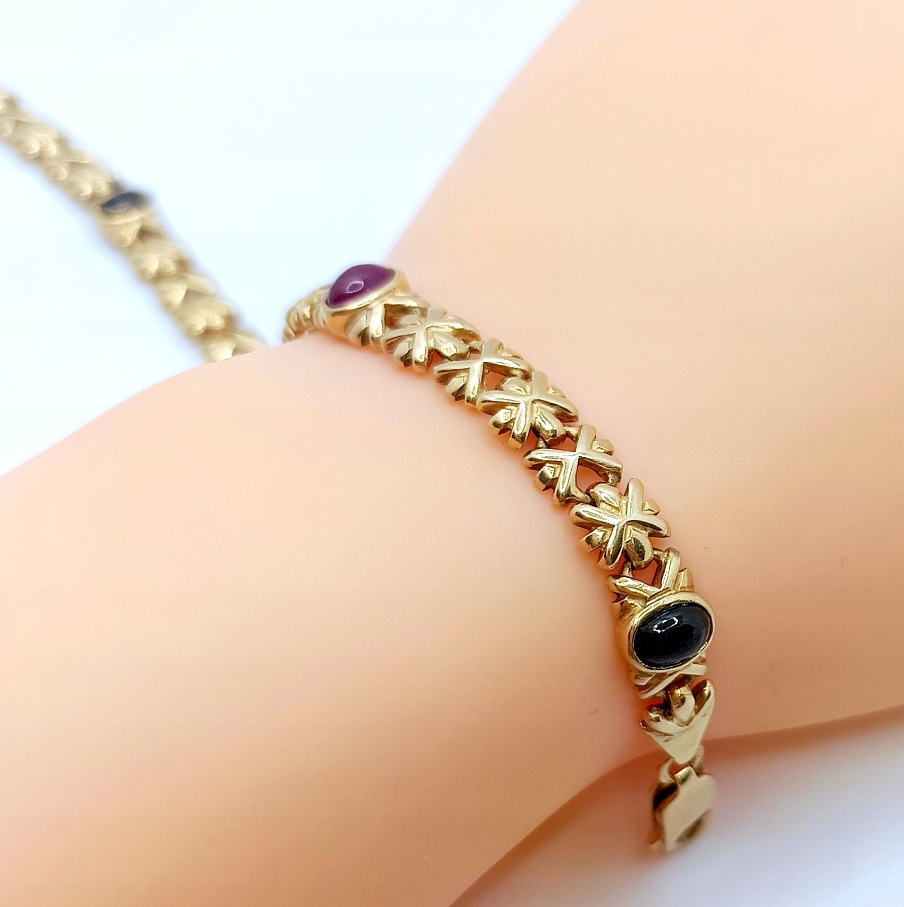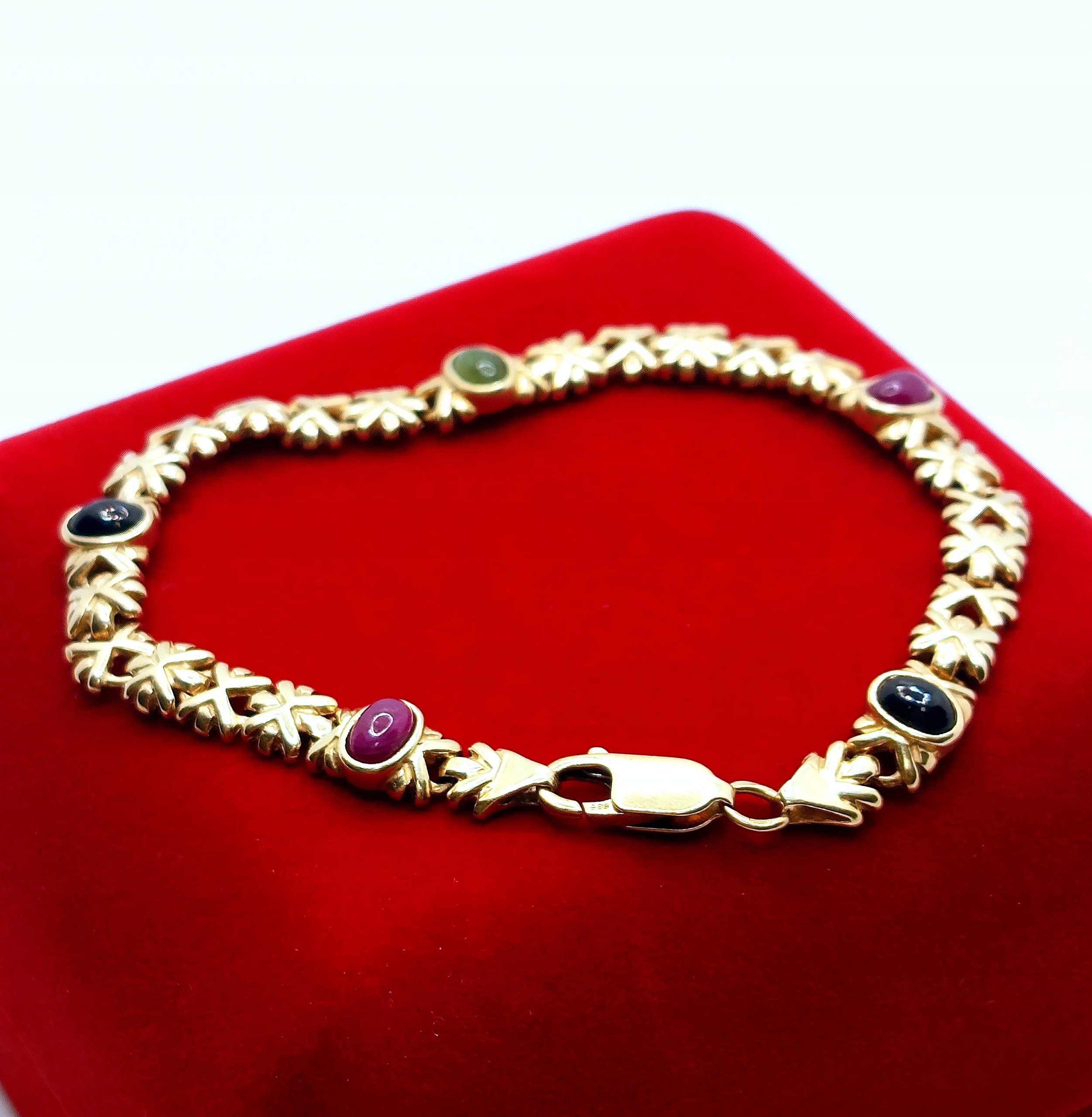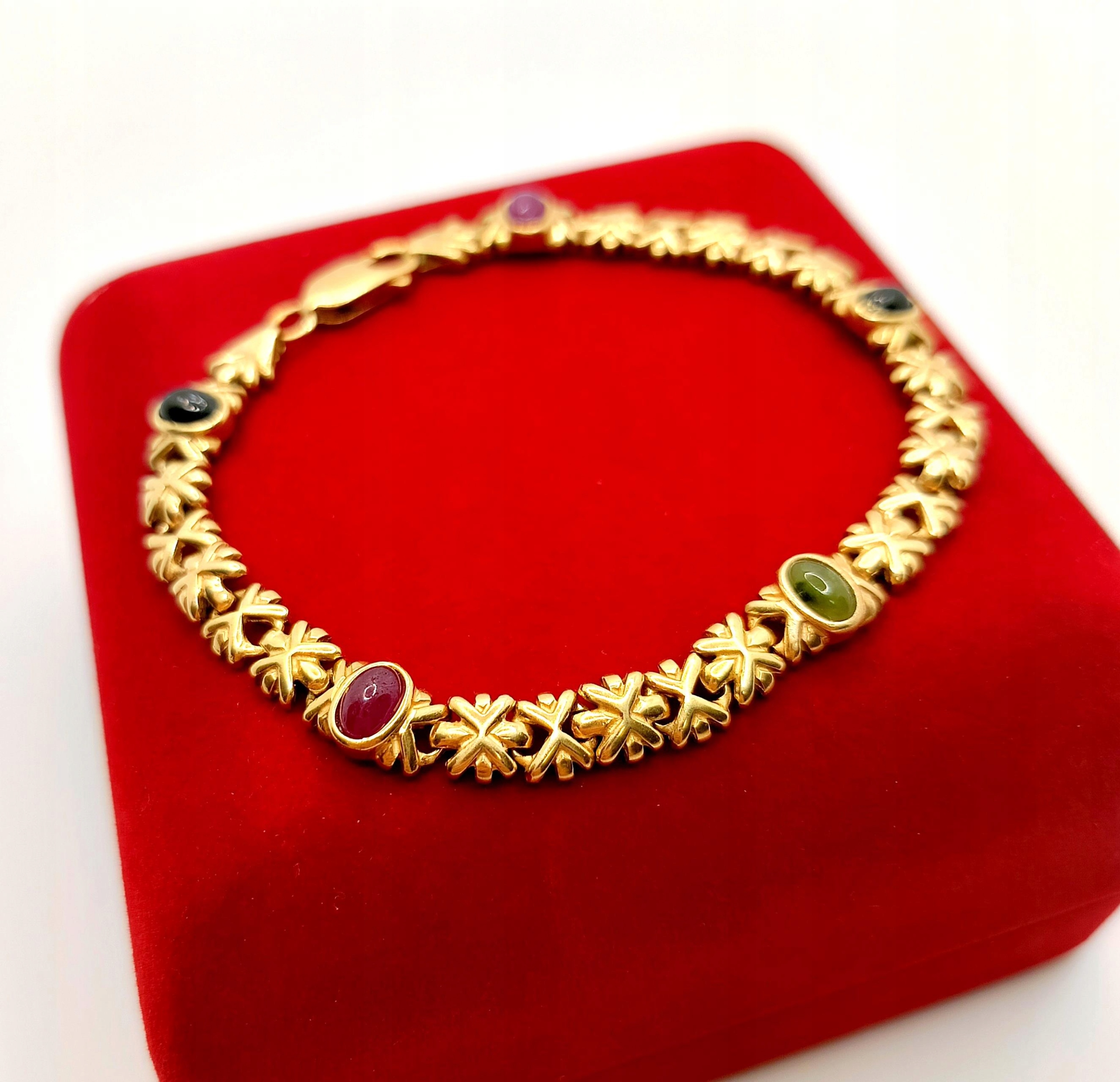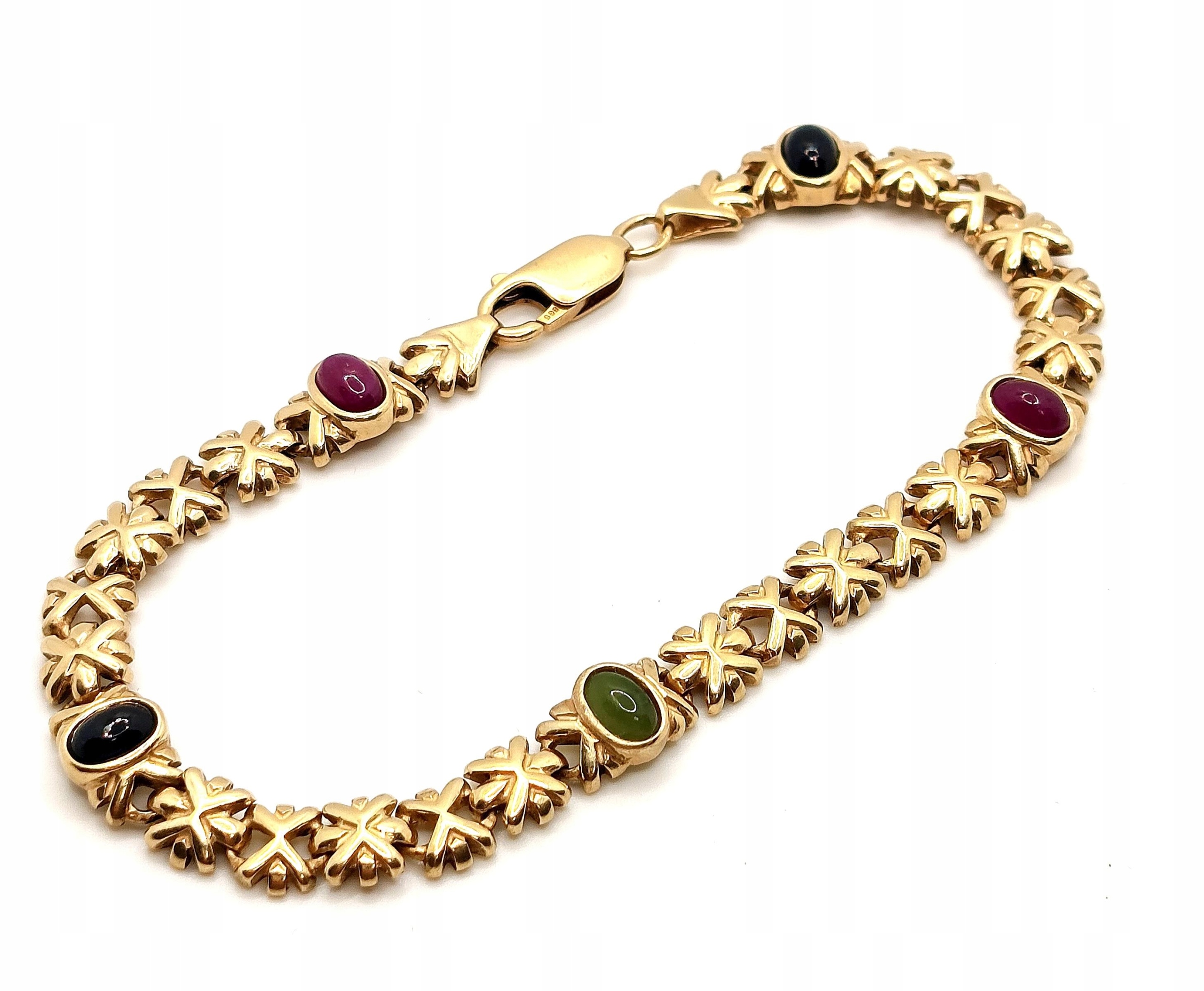 W ofercie na sprzedaż mamy dla Państwa piękną, złotą bransoletkę, ozdobioną naturalnymi kamieniami: rubiny, szafiry, agat.