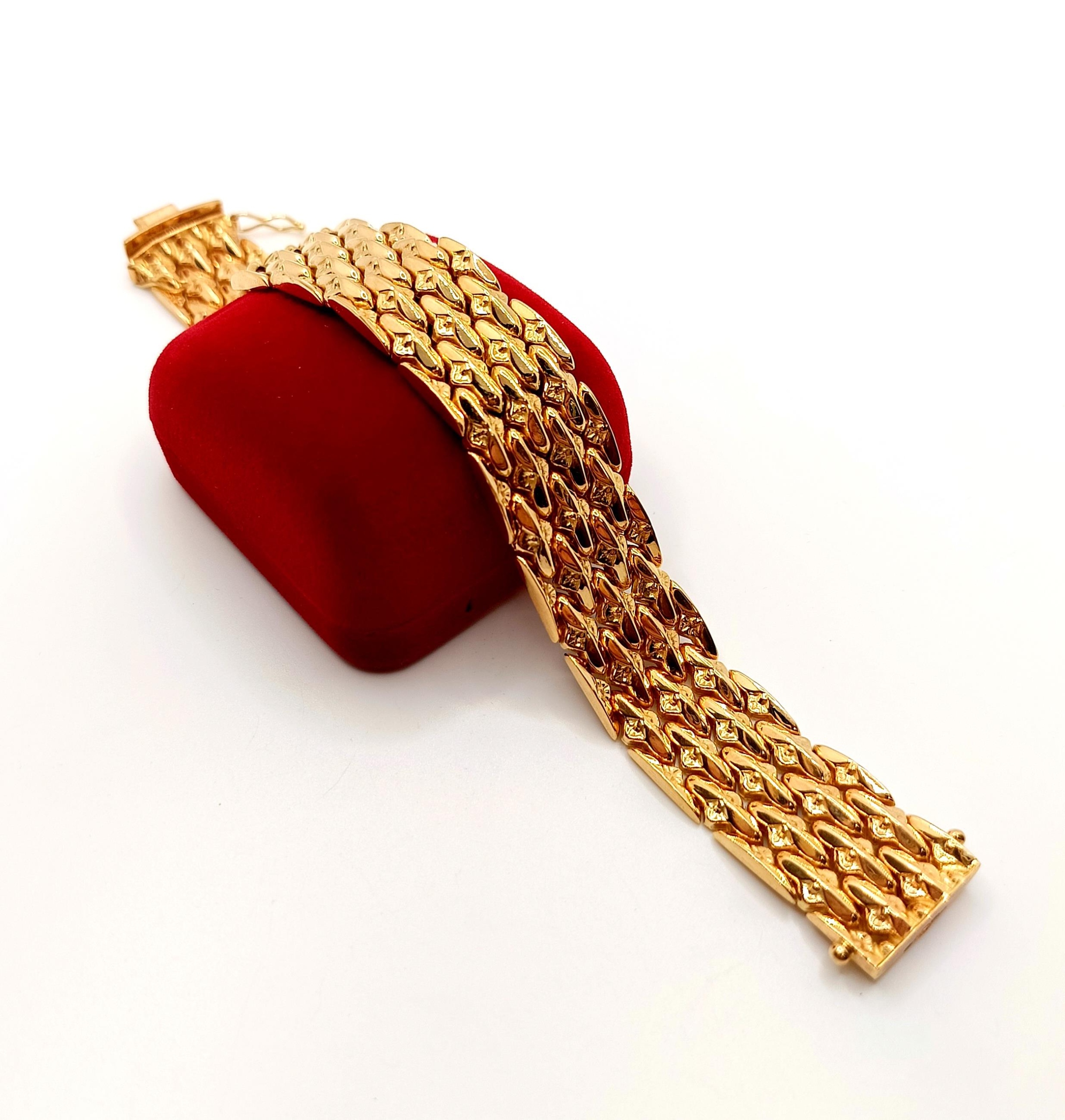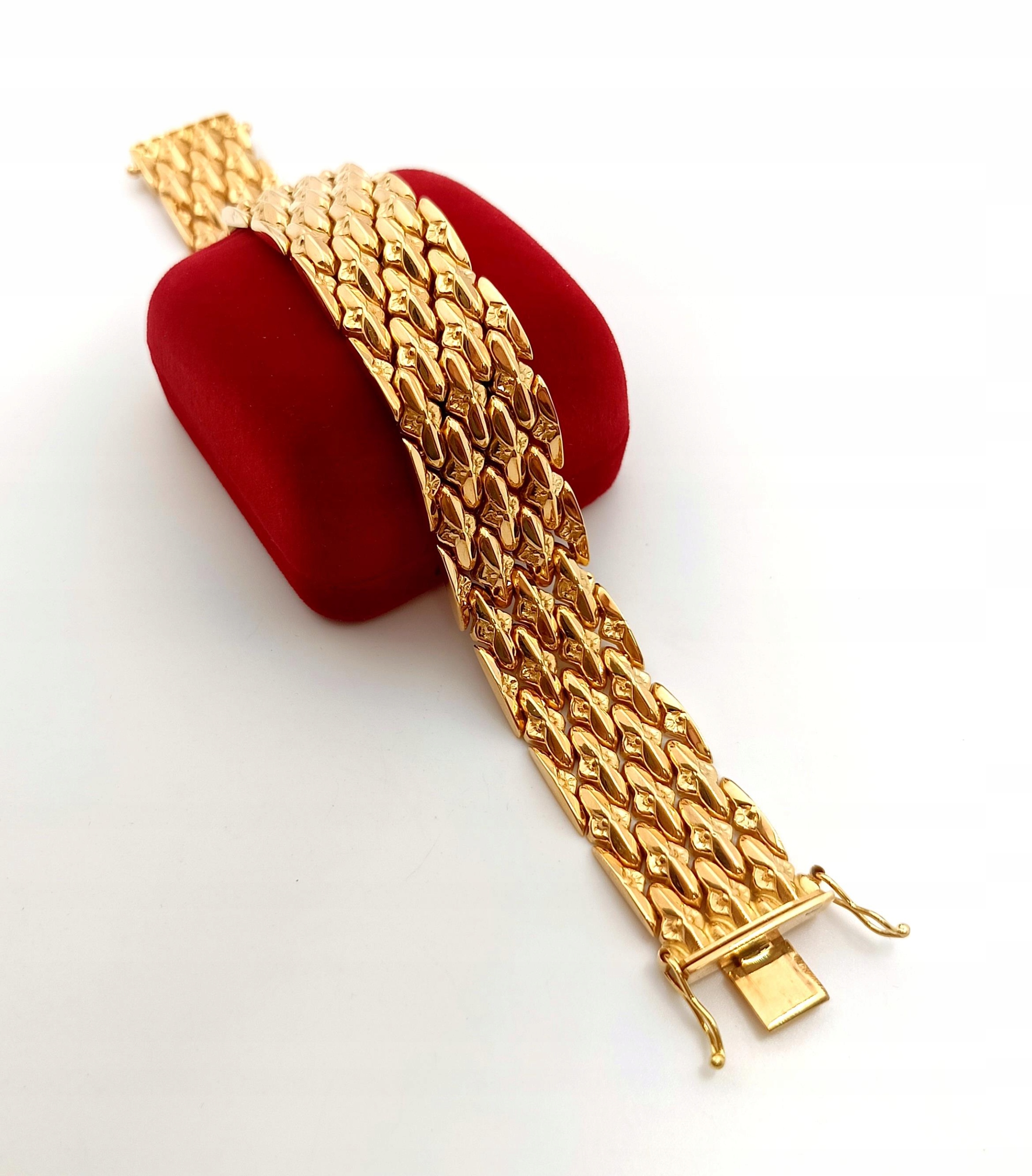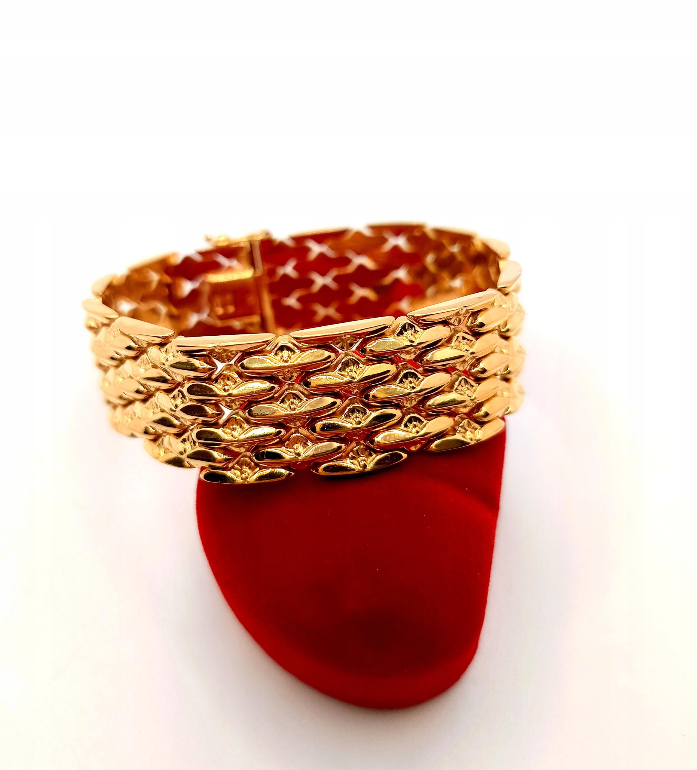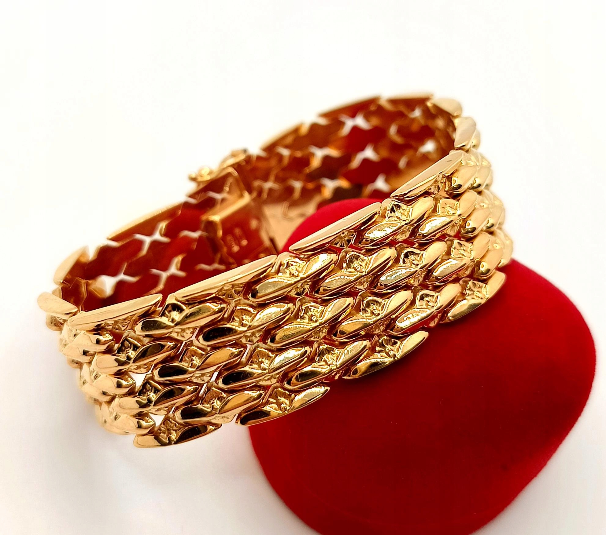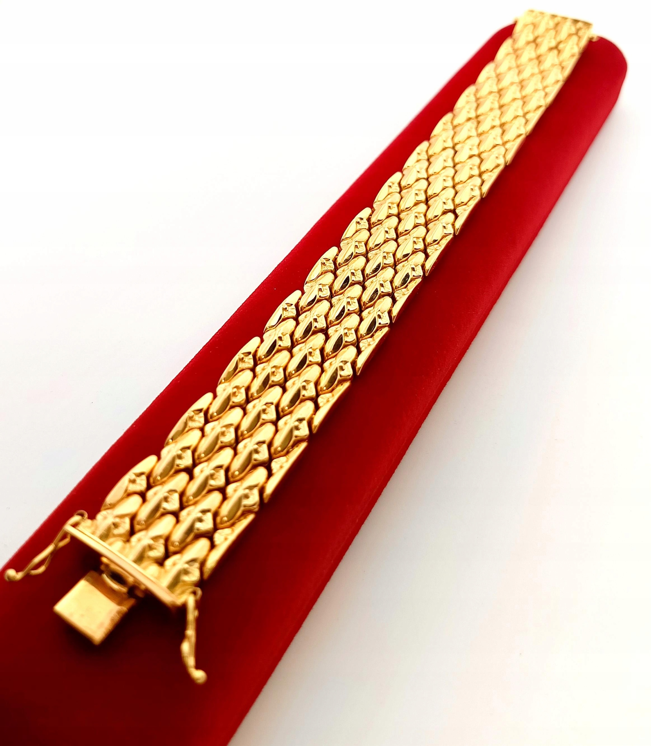 W ofercie na sprzedaż mamy dla Państwa złotą, szeroką bransoletkę, z pięknym wzorem z gęsto osadzonych ogniw pustych w środku.