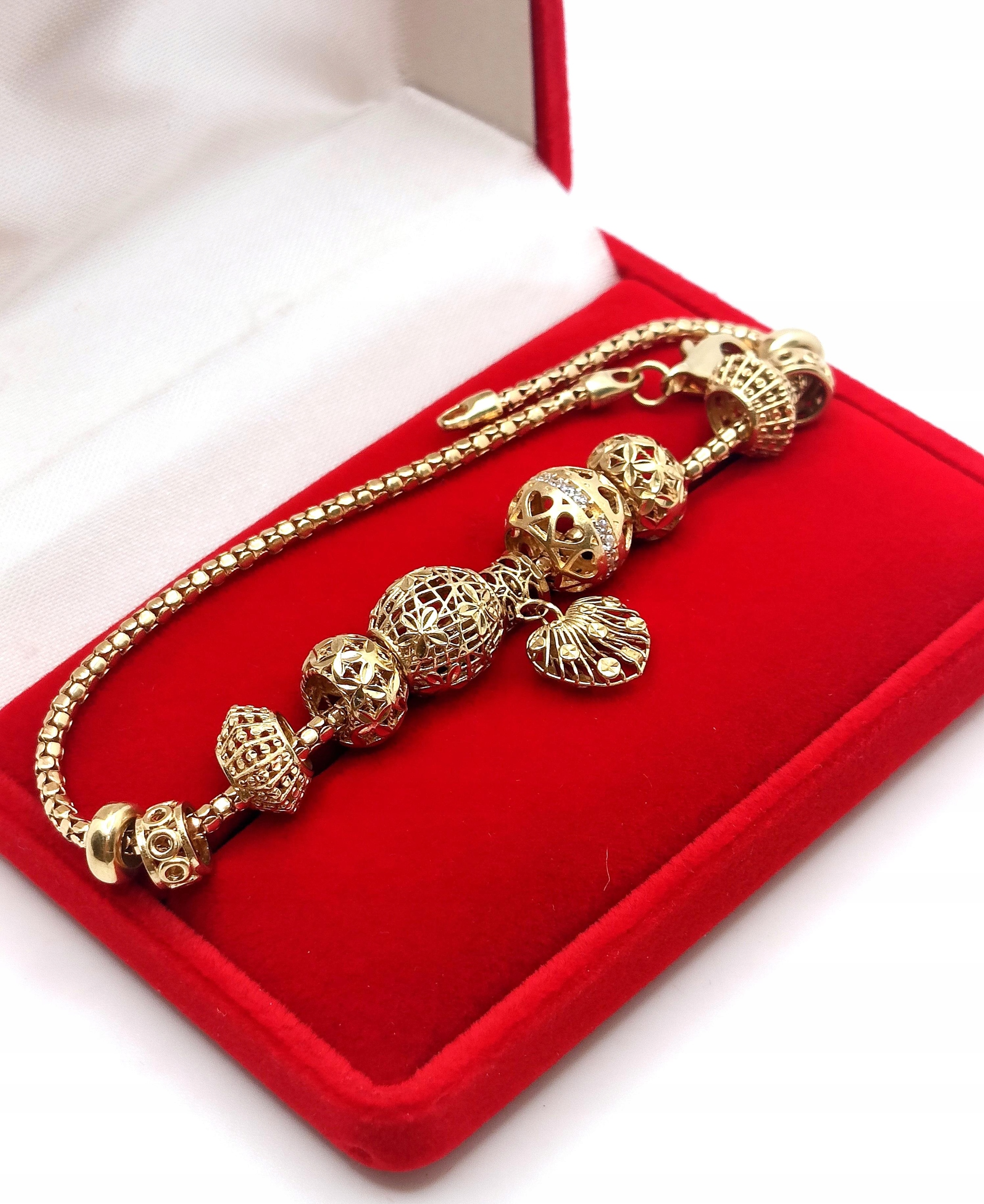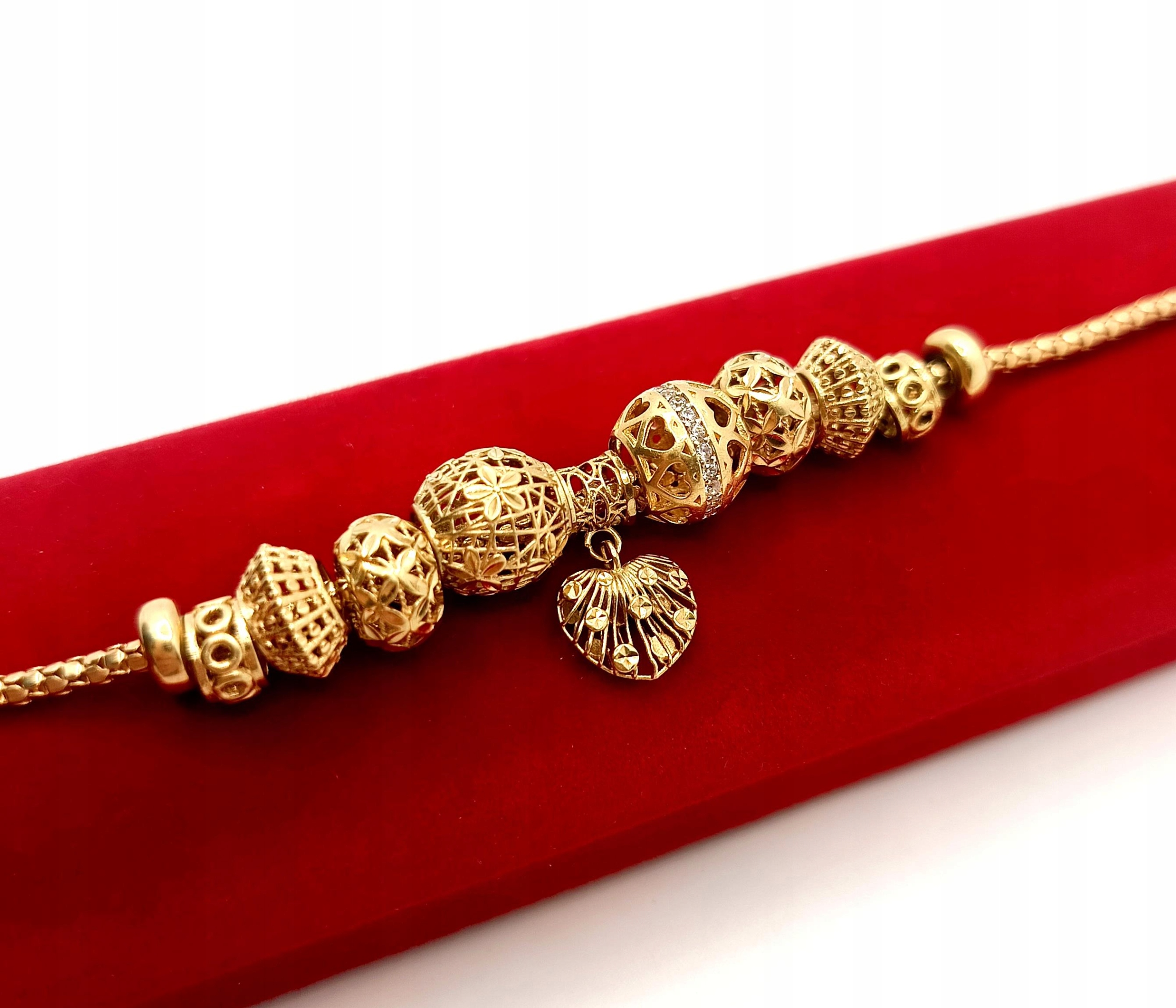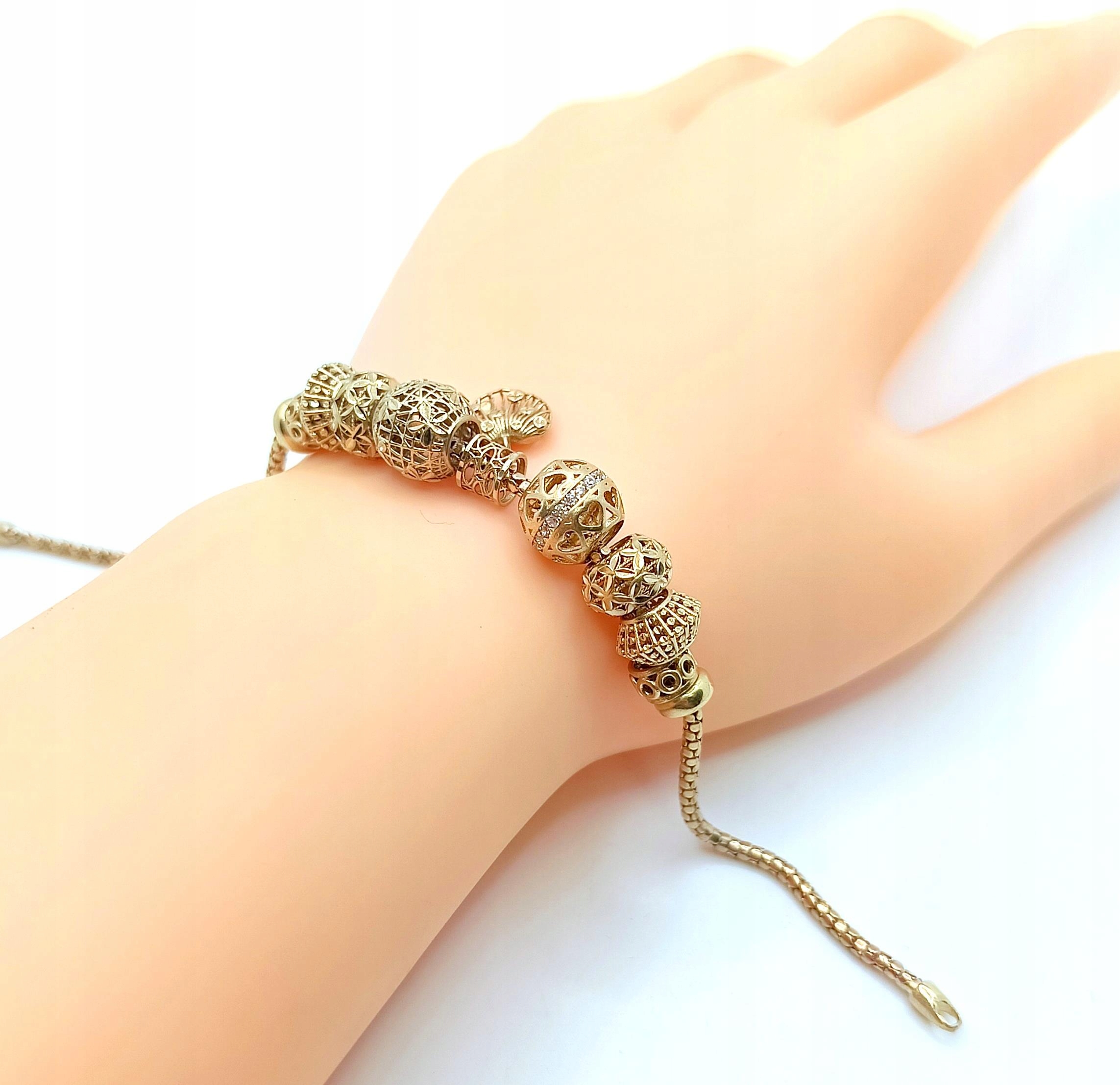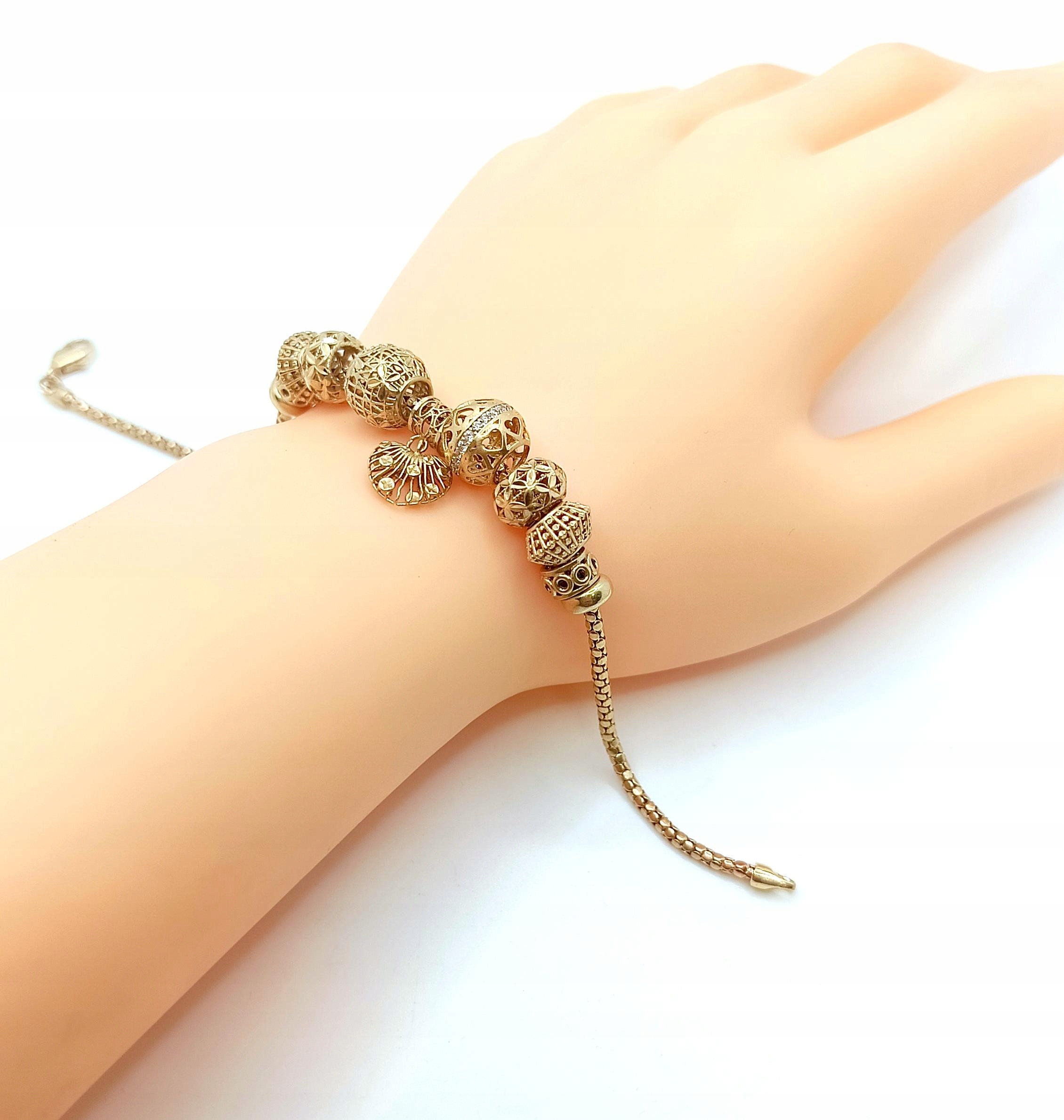 Oferujemy na sprzedaż piękną, złotą bransoletkę ozdobioną zawieszkami.