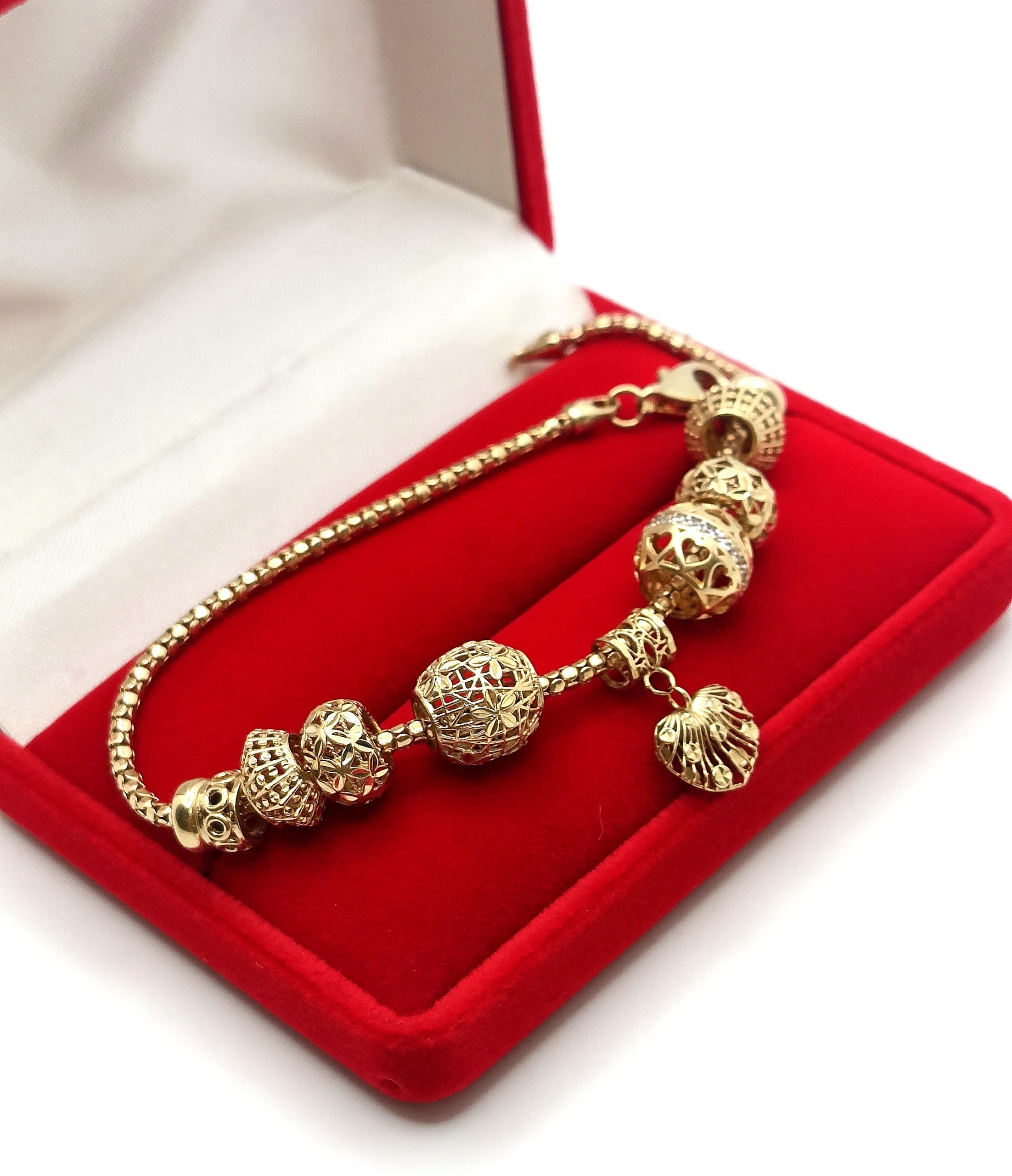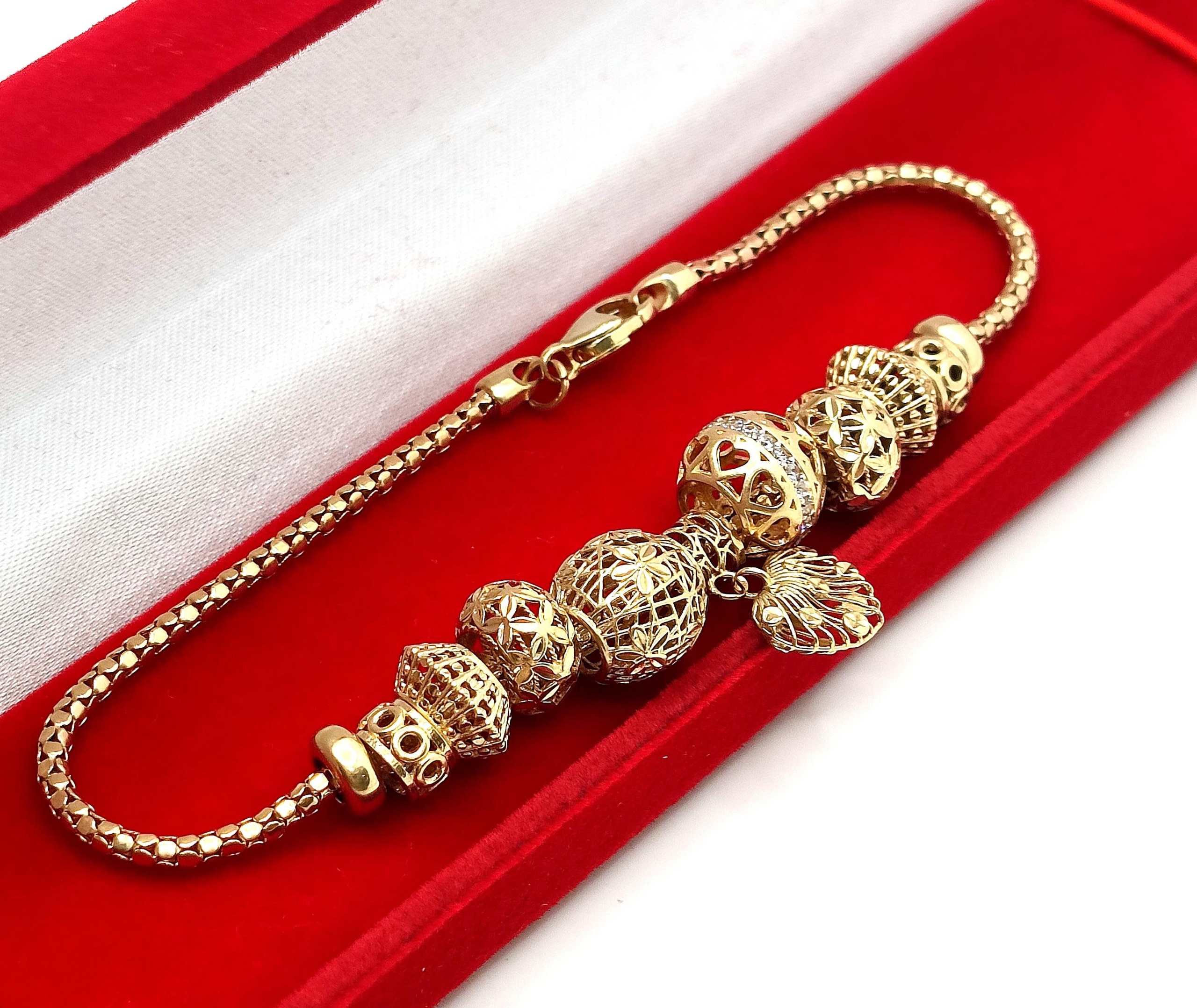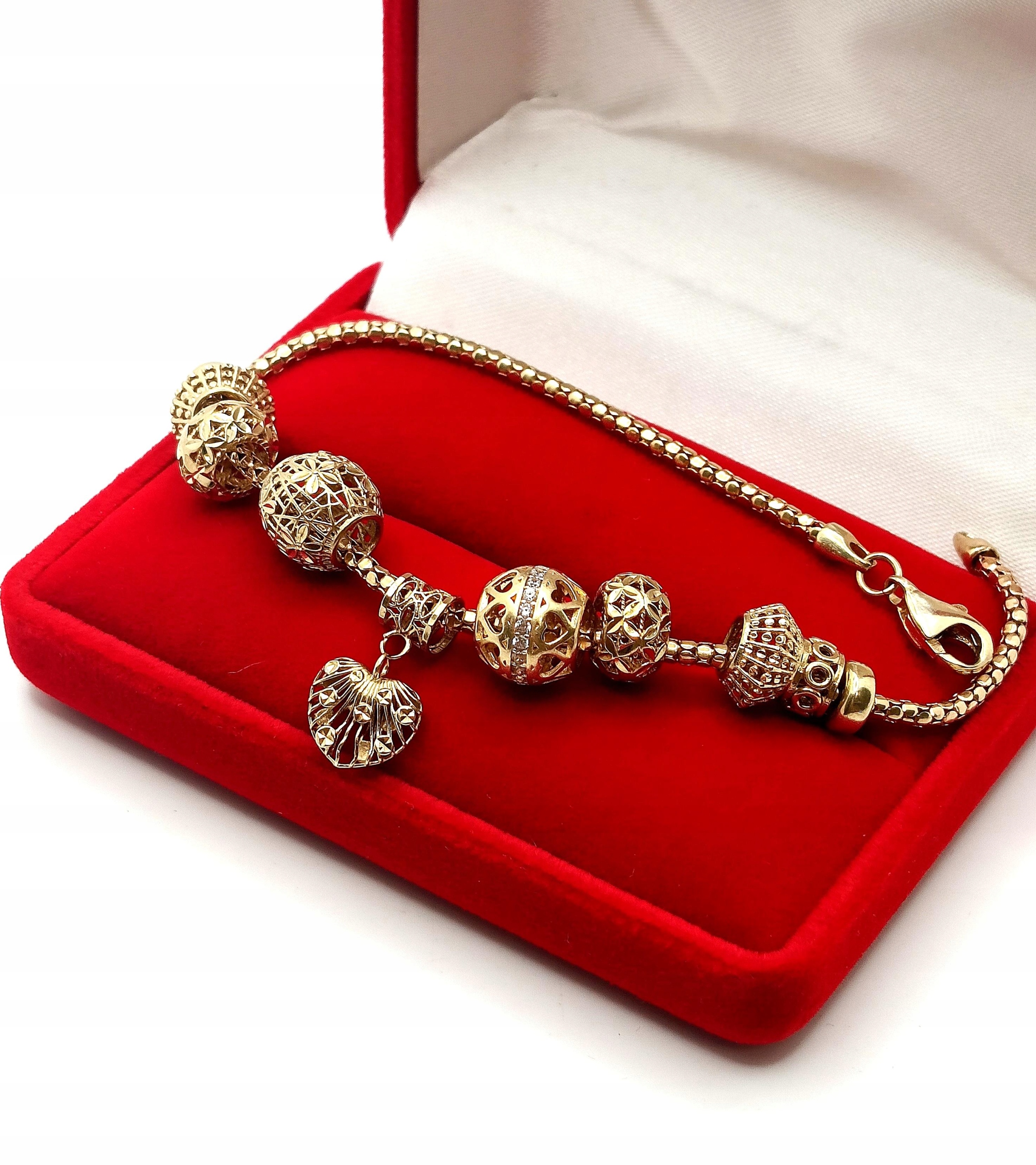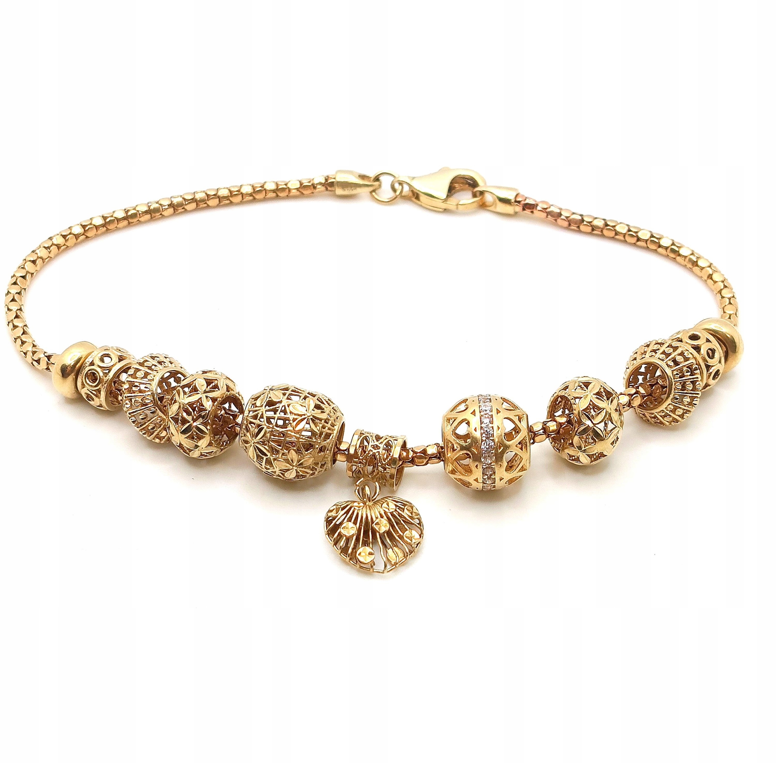 Oferujemy na sprzedaż piękną, złotą bransoletkę ozdobioną zawieszkami.