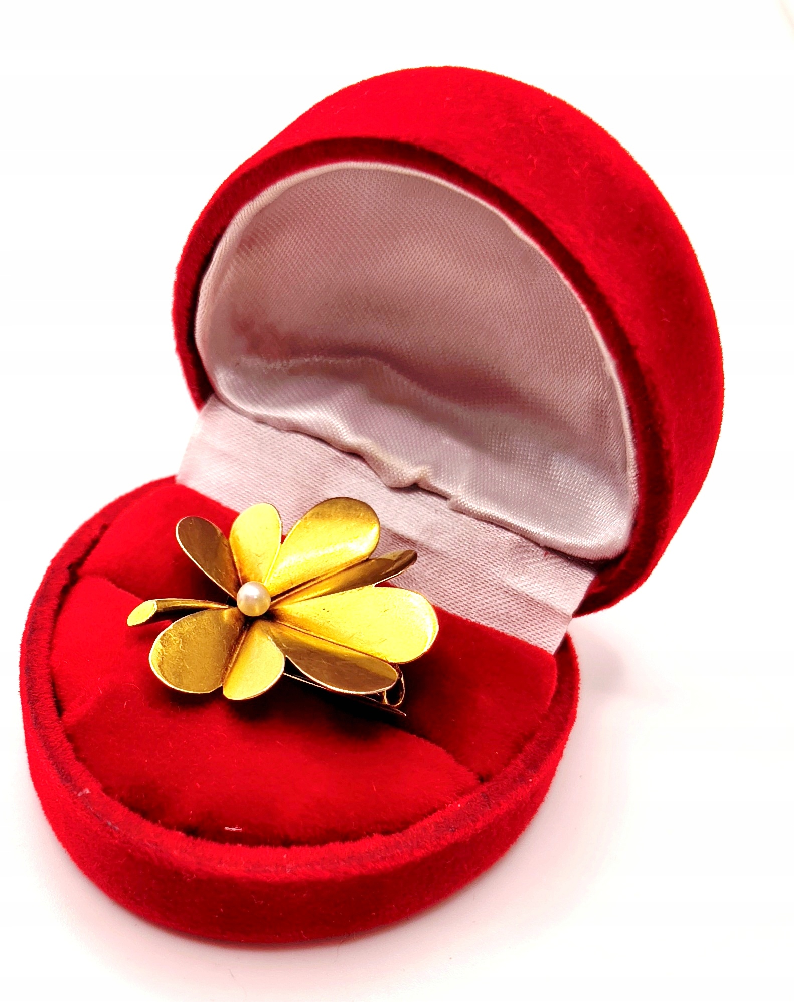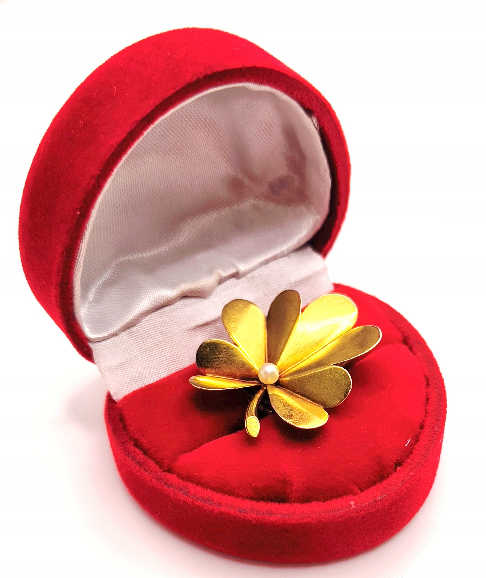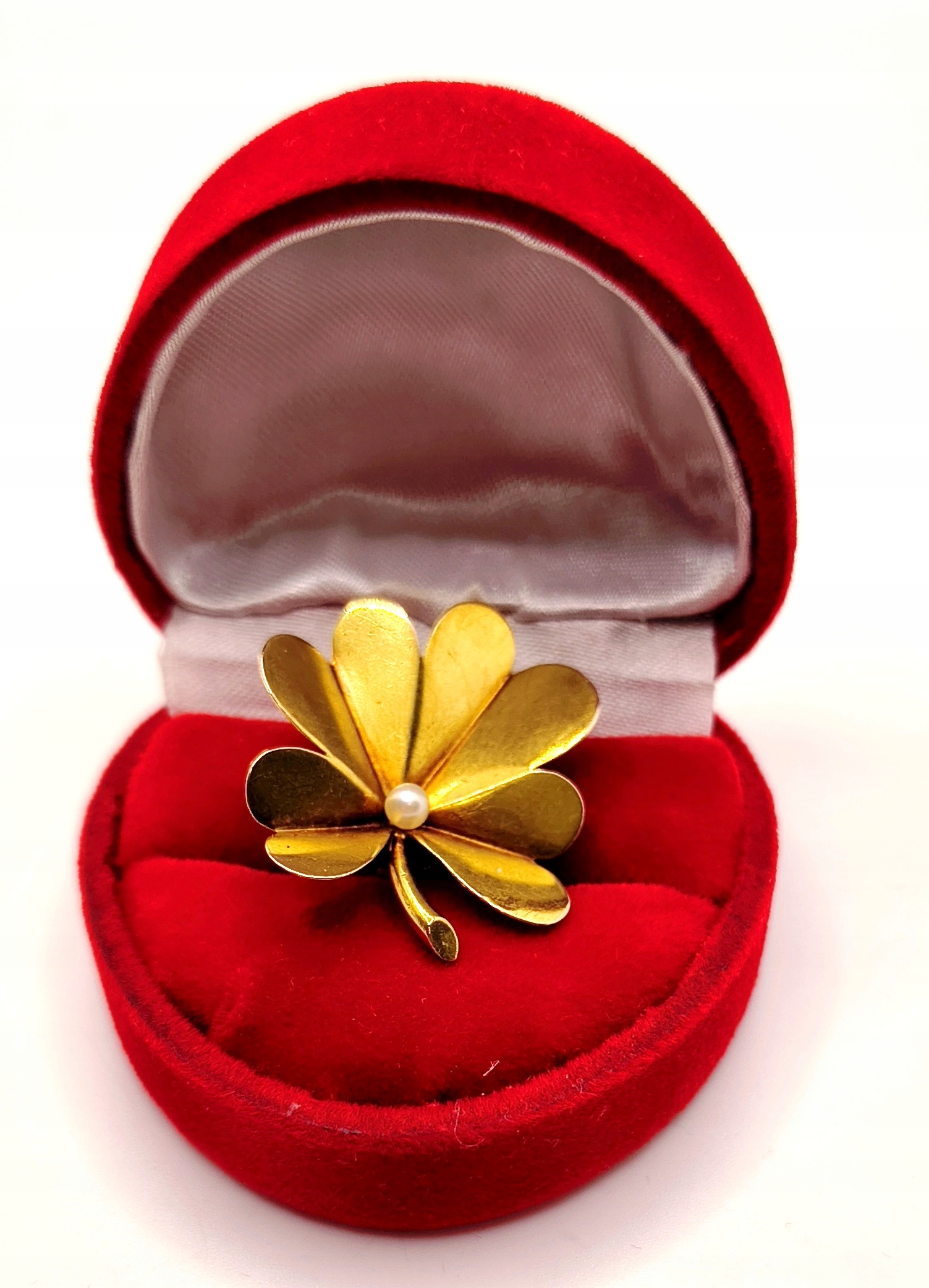 W ofercie na sprzedaż mamy dla państwa piękną, złotą broszkę w kształcie kwiatka ozdobionego perłą.
