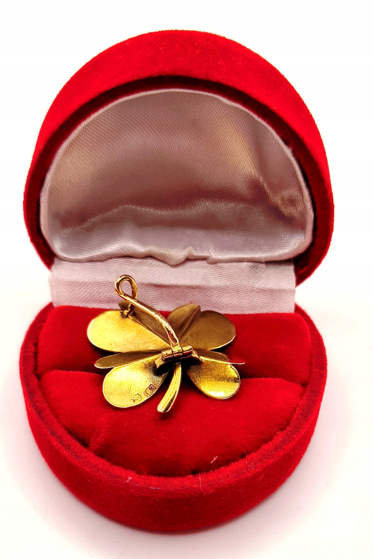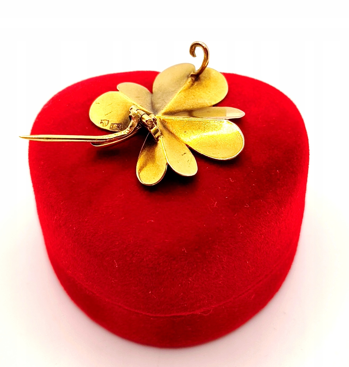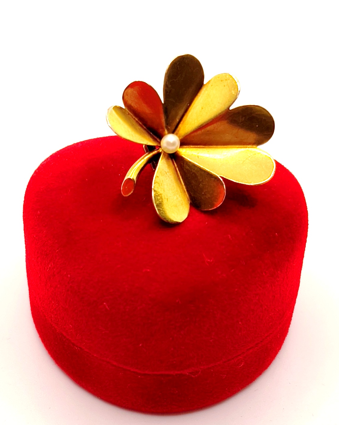 W ofercie na sprzedaż mamy dla państwa piękną, złotą broszkę w kształcie kwiatka ozdobionego perłą.