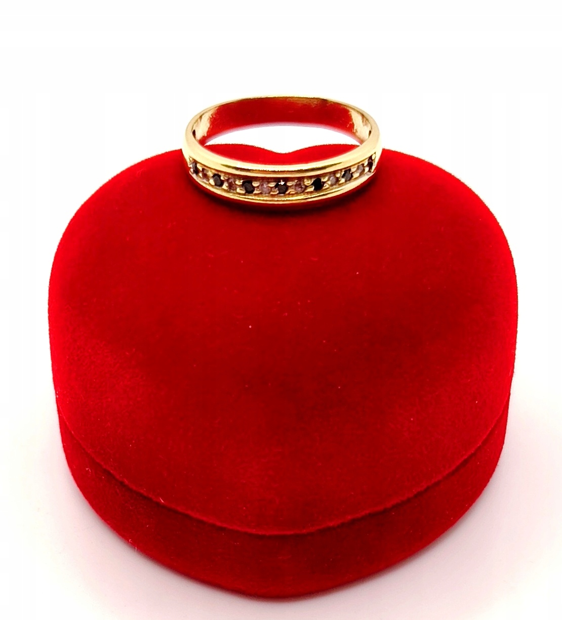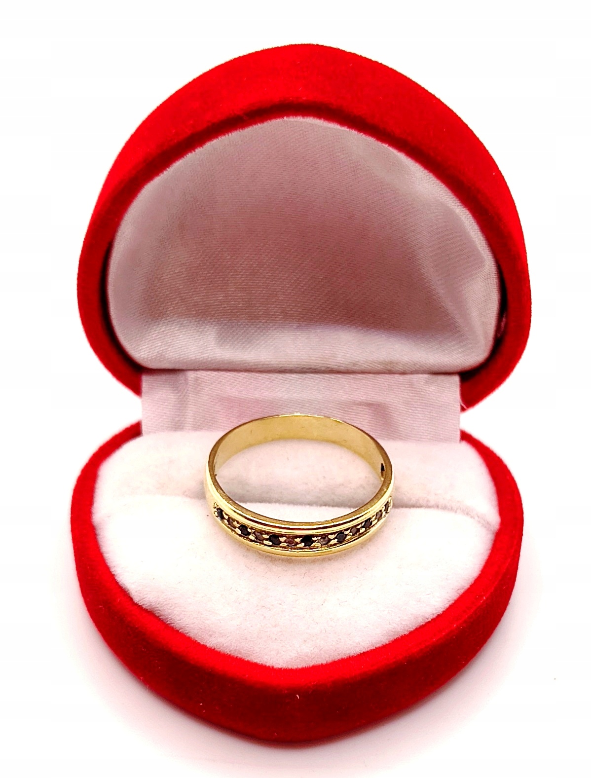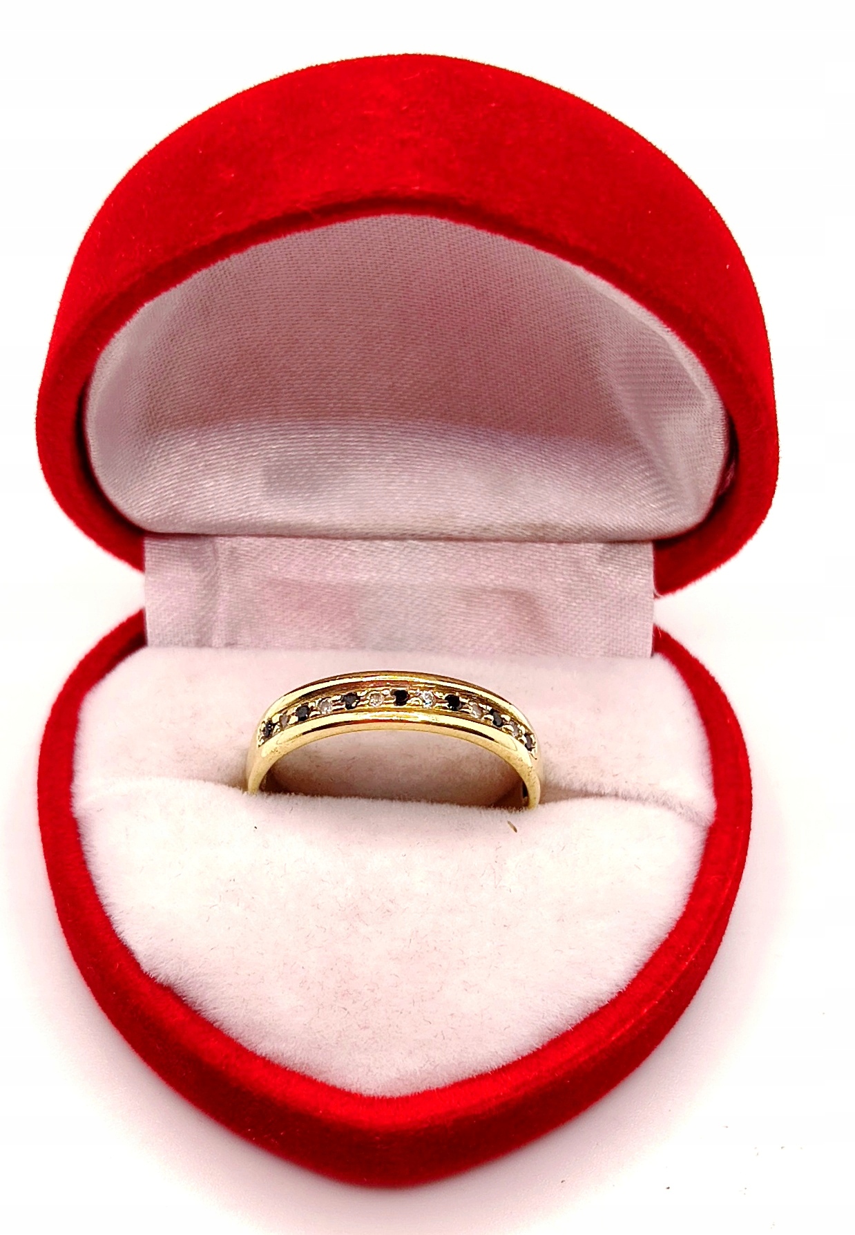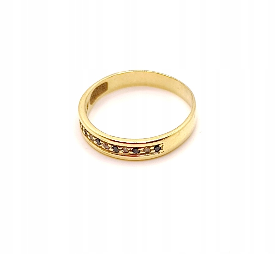 Oferujemy na sprzedaż piękną, złotą obrączkę ozdobioną białymi i czarnymi cyrkoniami.