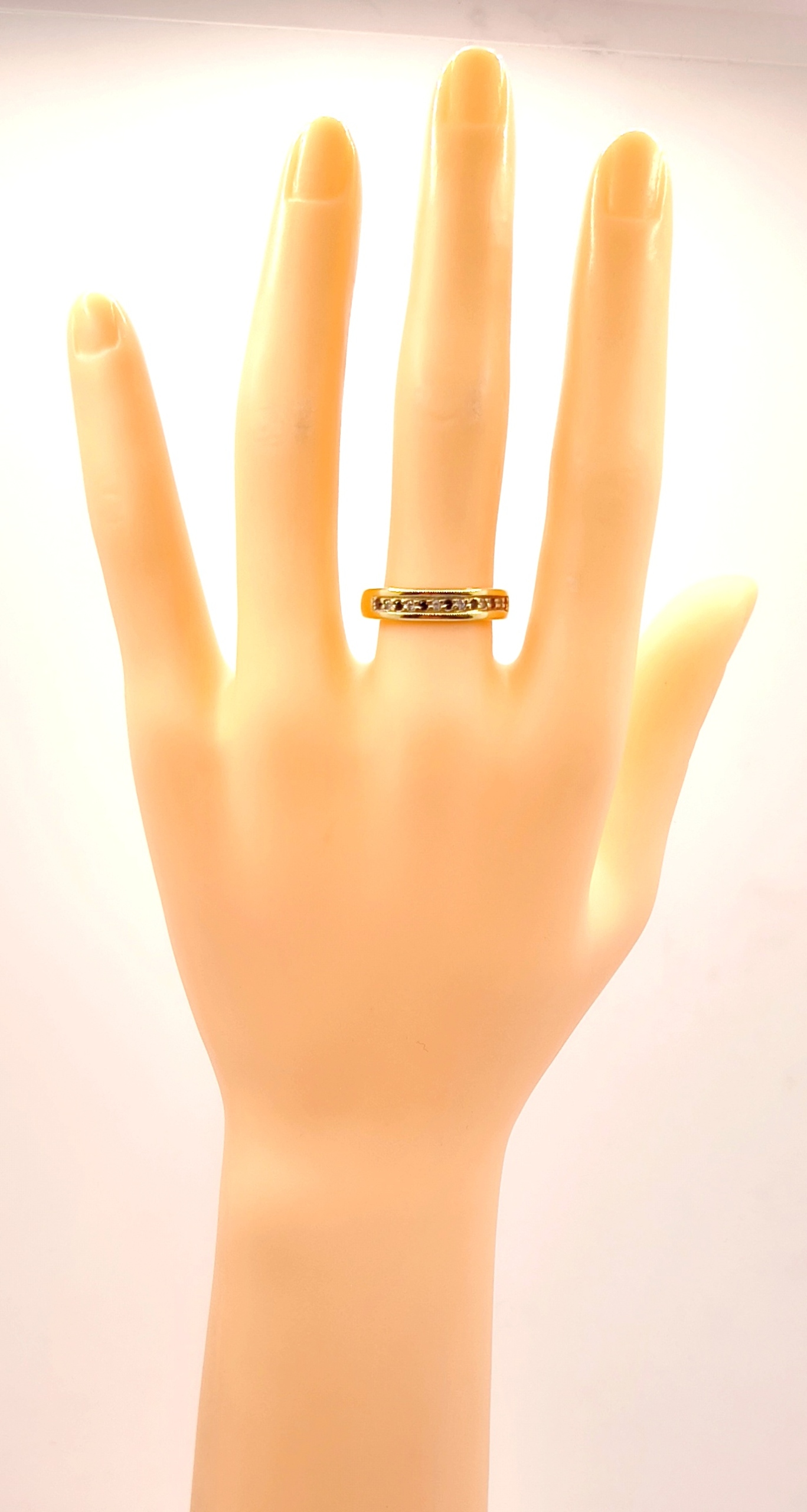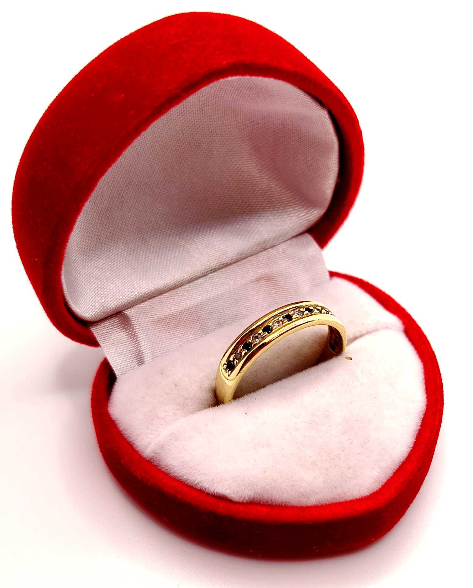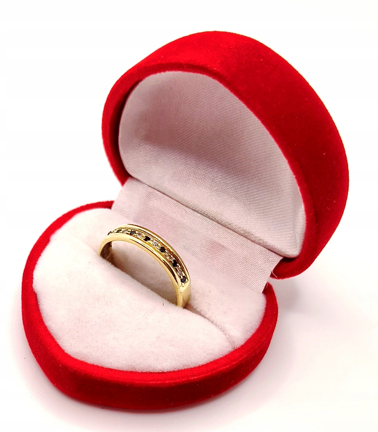 Oferujemy na sprzedaż piękną, złotą obrączkę ozdobioną białymi i czarnymi cyrkoniami.