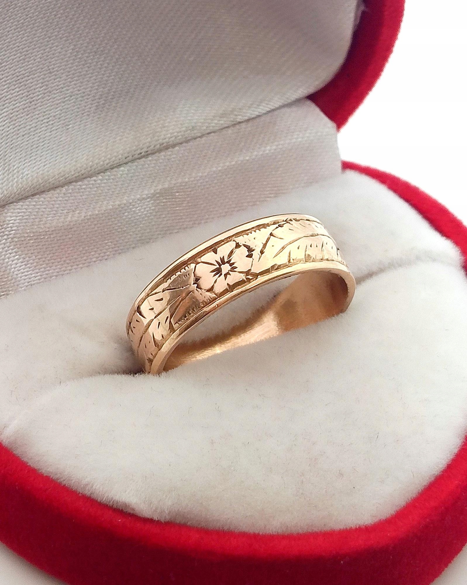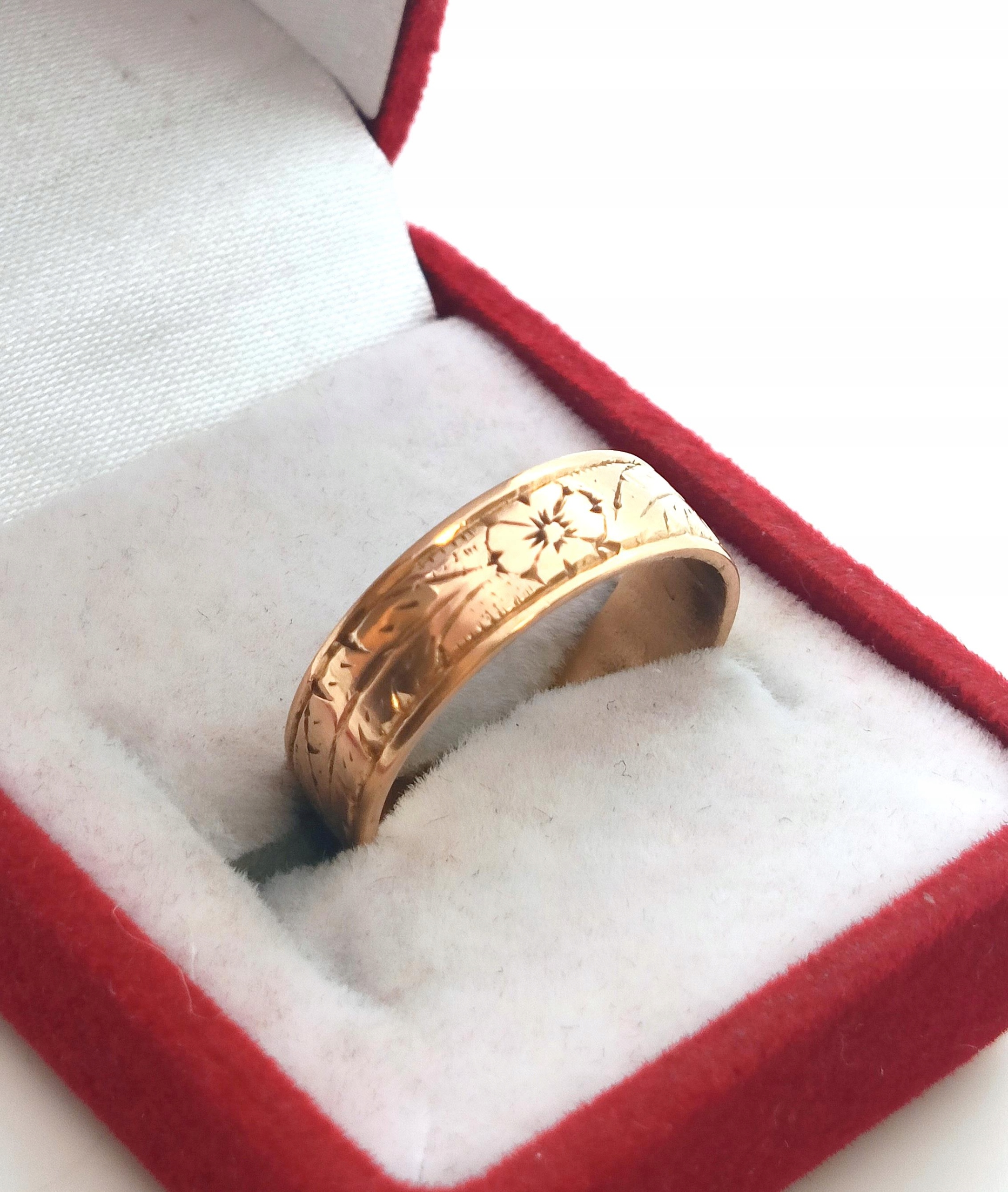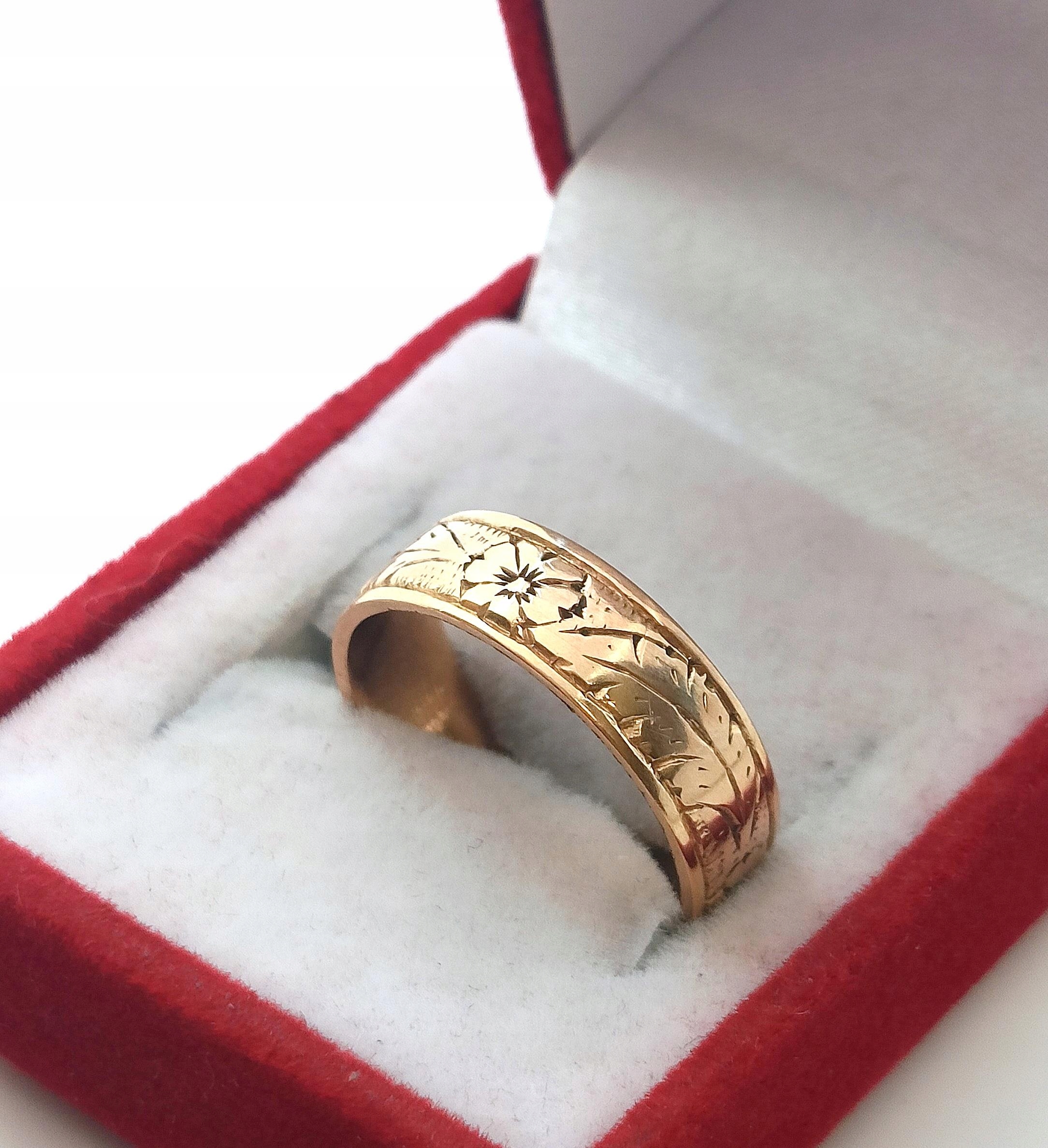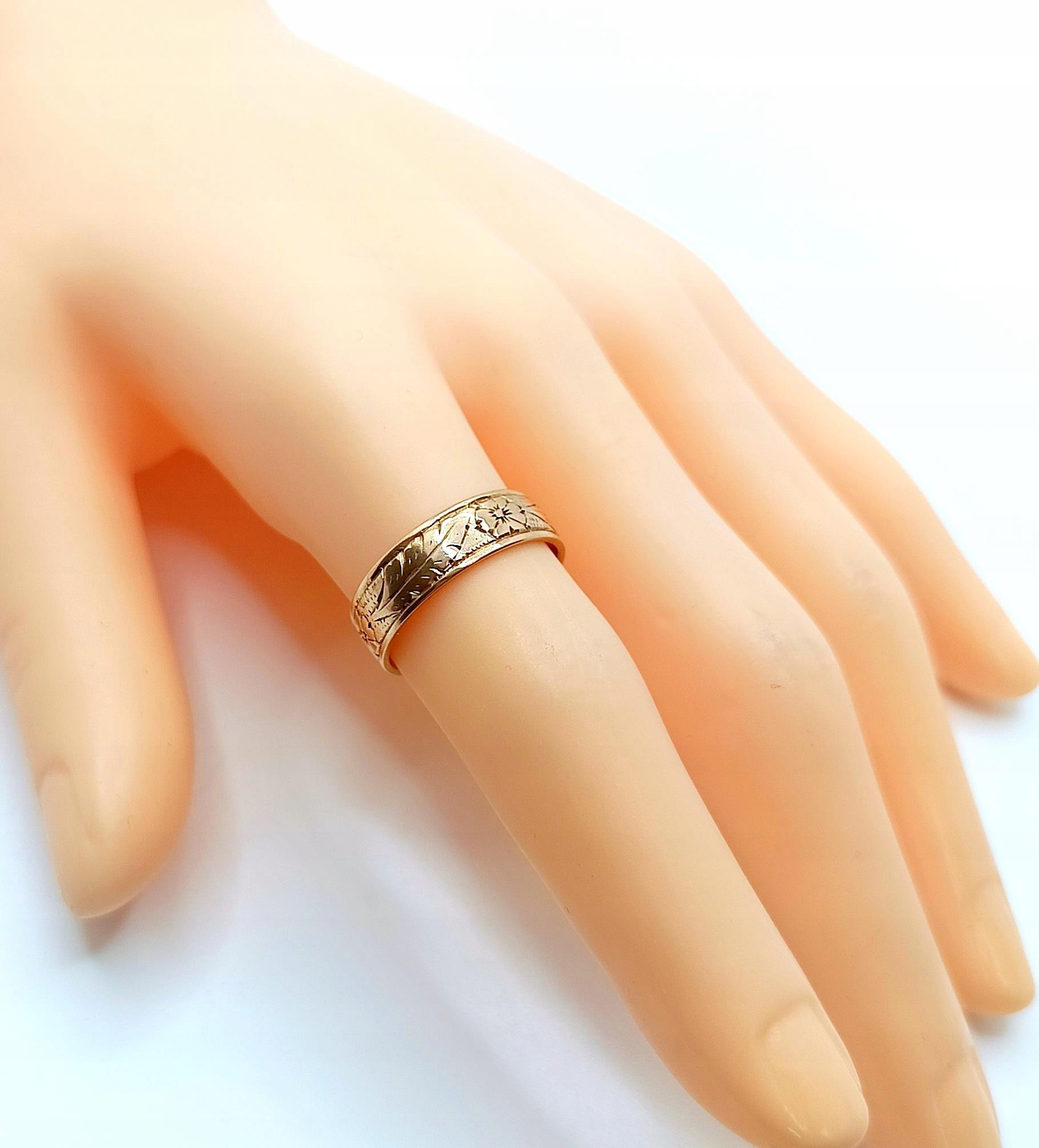 W ofercie na sprzedaż mamy dla Państwa złotą obrączkę o szerokości 5mm z pięknym motywem roślinnym- kwiaty oraz liście.
