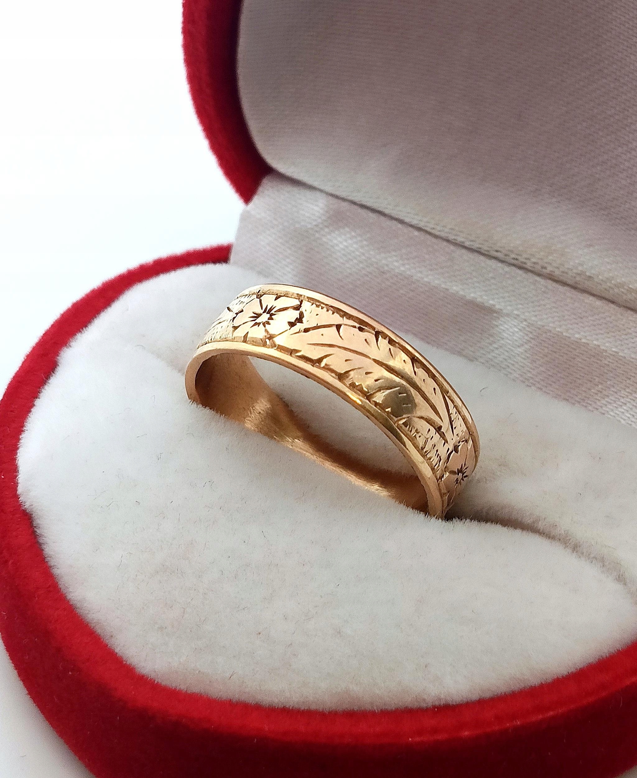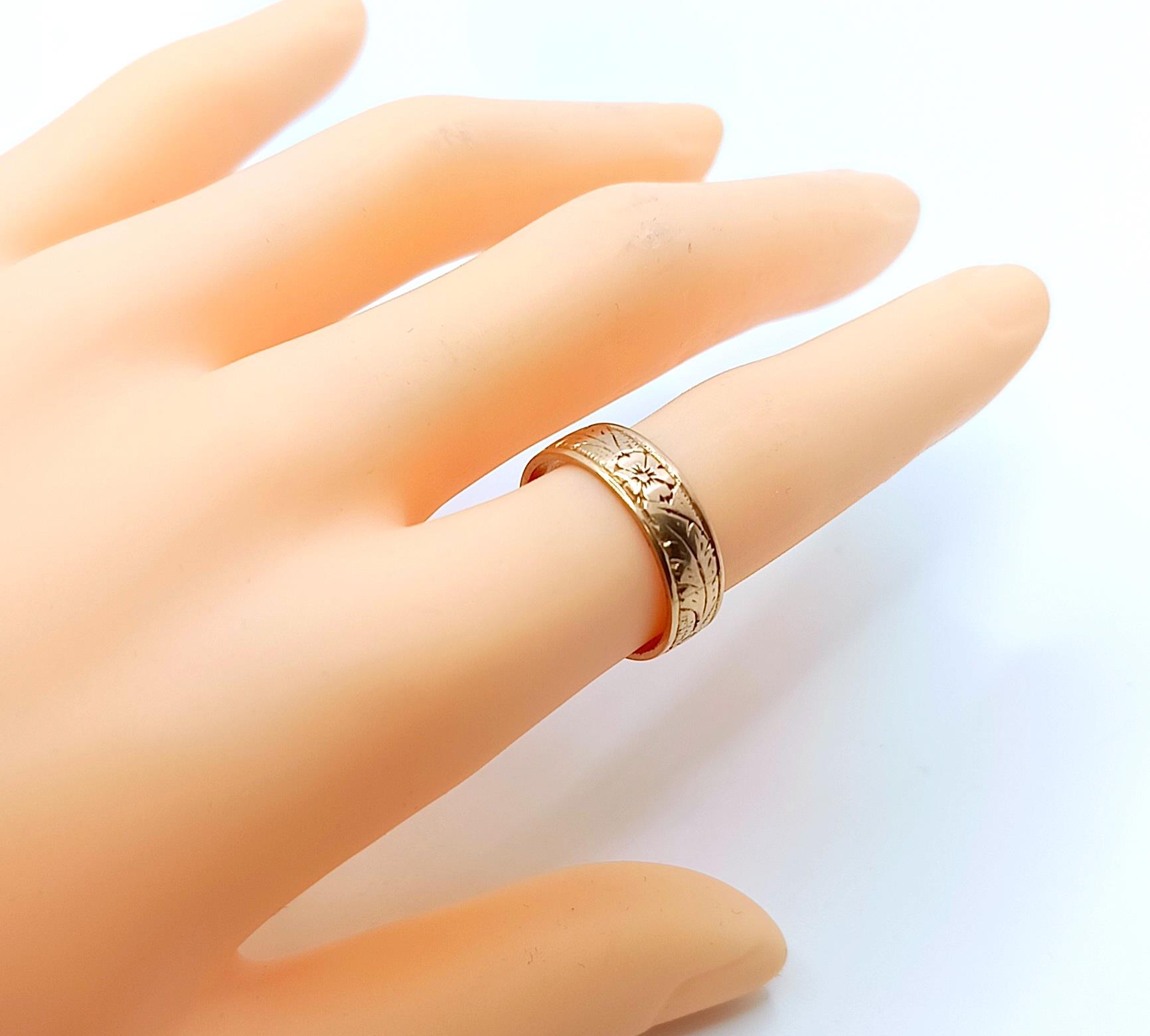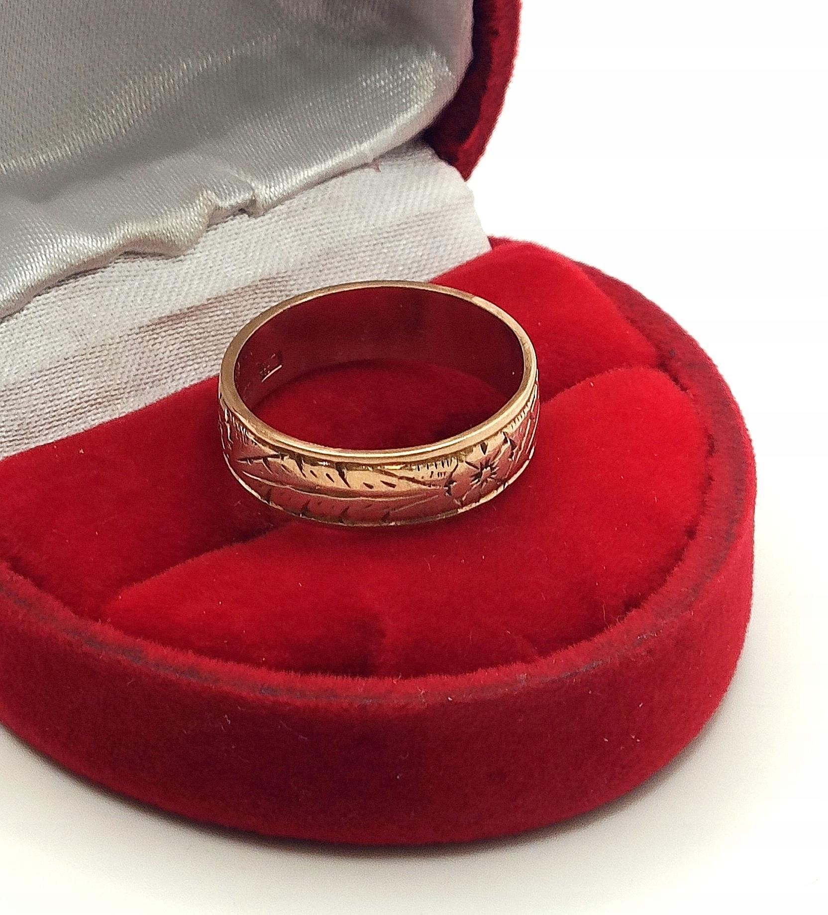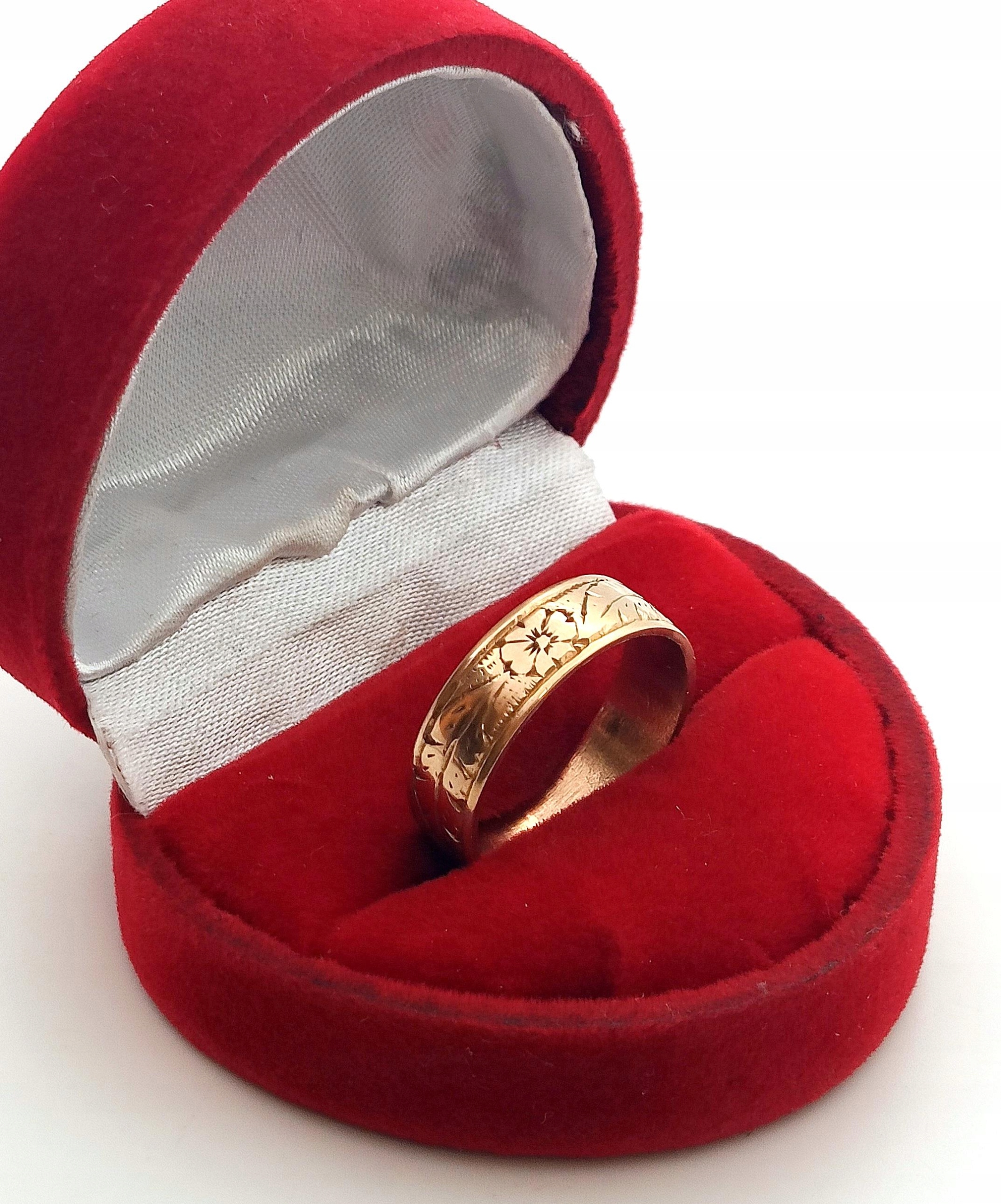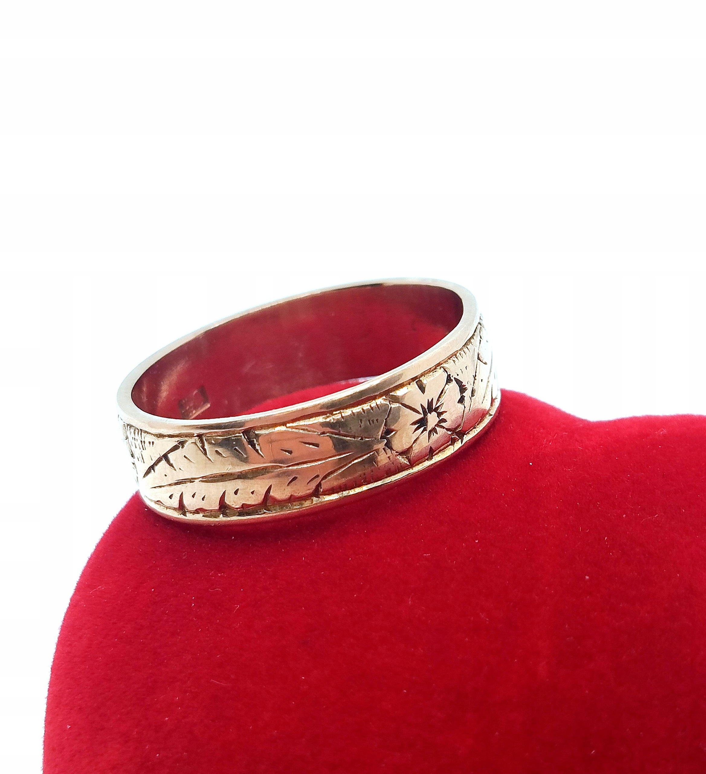 W ofercie na sprzedaż mamy dla Państwa złotą obrączkę o szerokości 5mm z pięknym motywem roślinnym- kwiaty oraz liście.